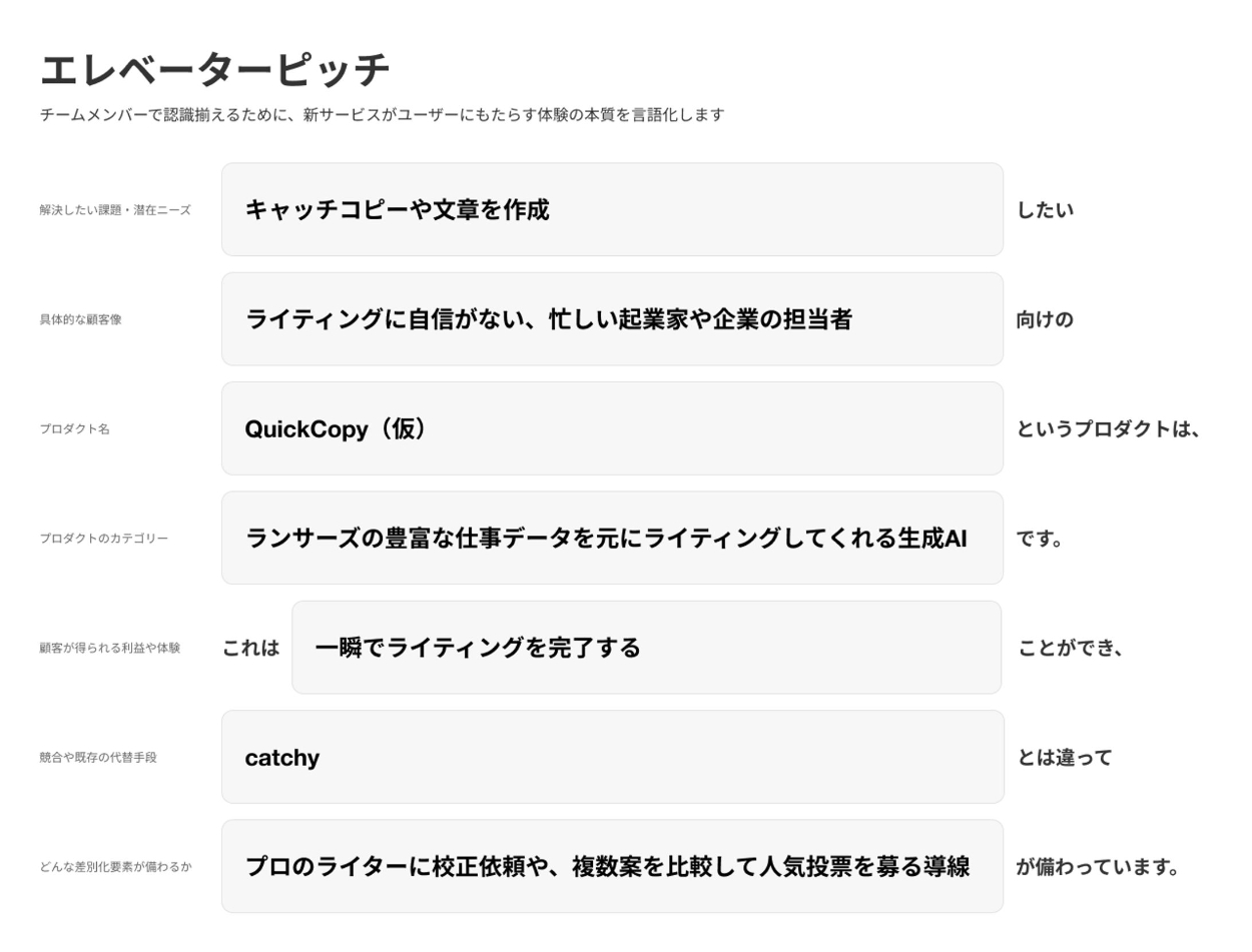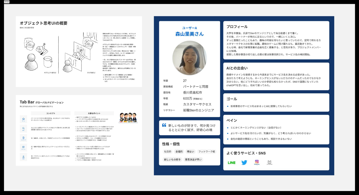 結果をもってプロダクトオーナーと議論。結果を要約する形で、サービスのコンセプト(エレベーターピッチ)とペルソナを作成。