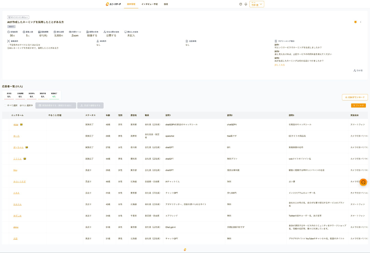 どのような人が何を求めて生成AIを使ってるか知りたい、と打診されたため、インタビュープラットフォームでインタビュイーを募集し1週間で探索型リサーチを実施。