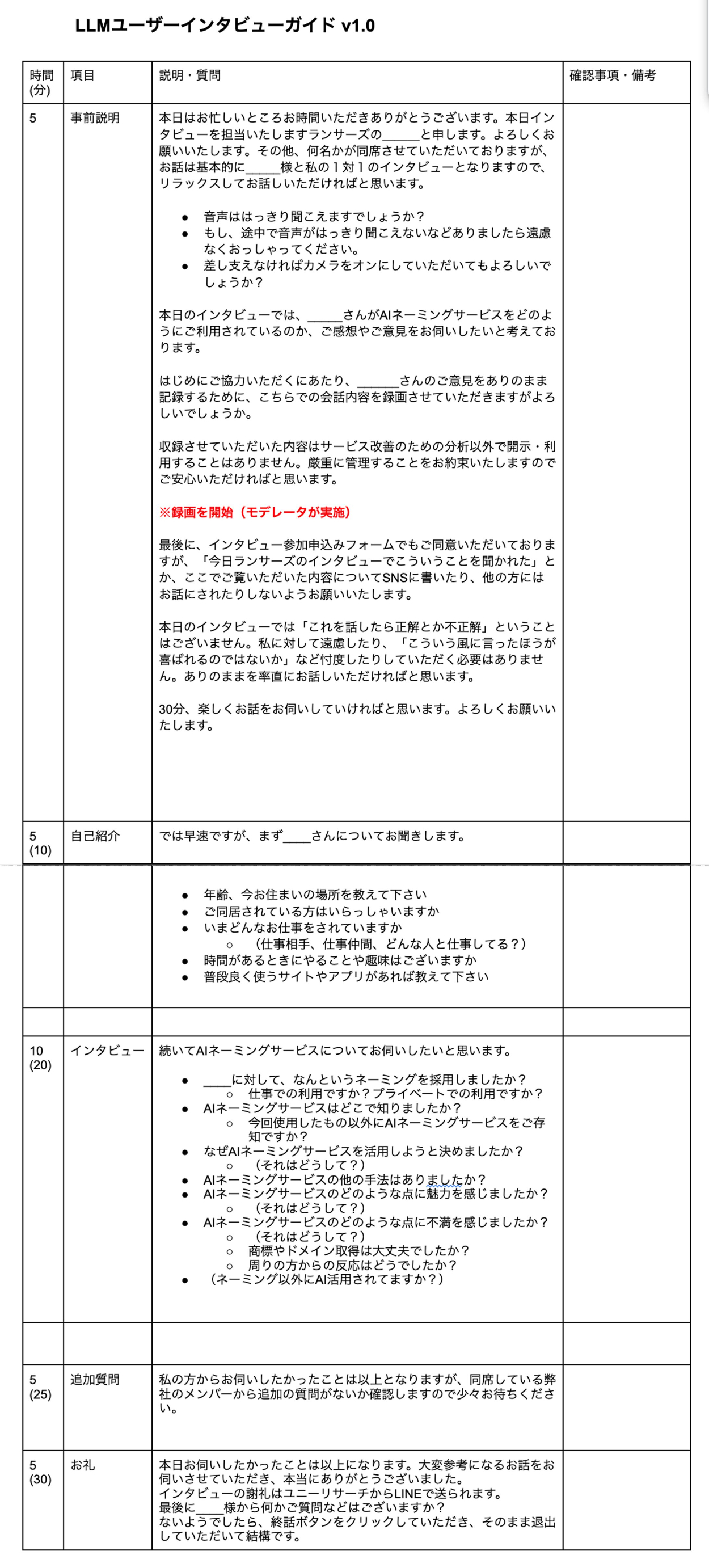 内容はインタビューガイドで事前に用意しました。