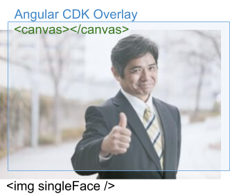 imgタグやvideoタグにsingleFaceなどの属性をつけると、Angular Material Overlay上のキャンバスに顔認識の結果をレンダリングする。