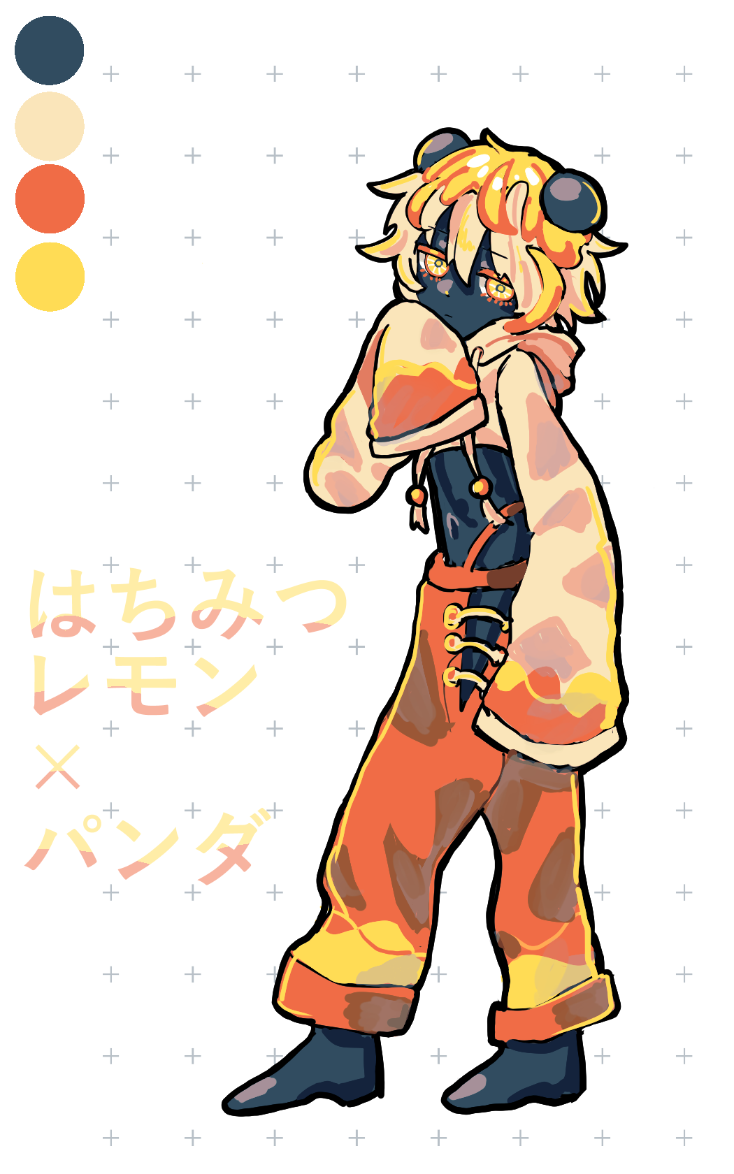 お題が両方のんびりしたイメージなので眠たげな男の子&ゆったりしたラフな服に決め、パンダからすこし中華っぽい装飾を入れました。はちみつを頭からかぶったようなツーカラーの髪型、服のすその柄で液体感を出しています。クロップド丈のパーカー、足がはだしなのはそのままパンダの柄がモチーフです。