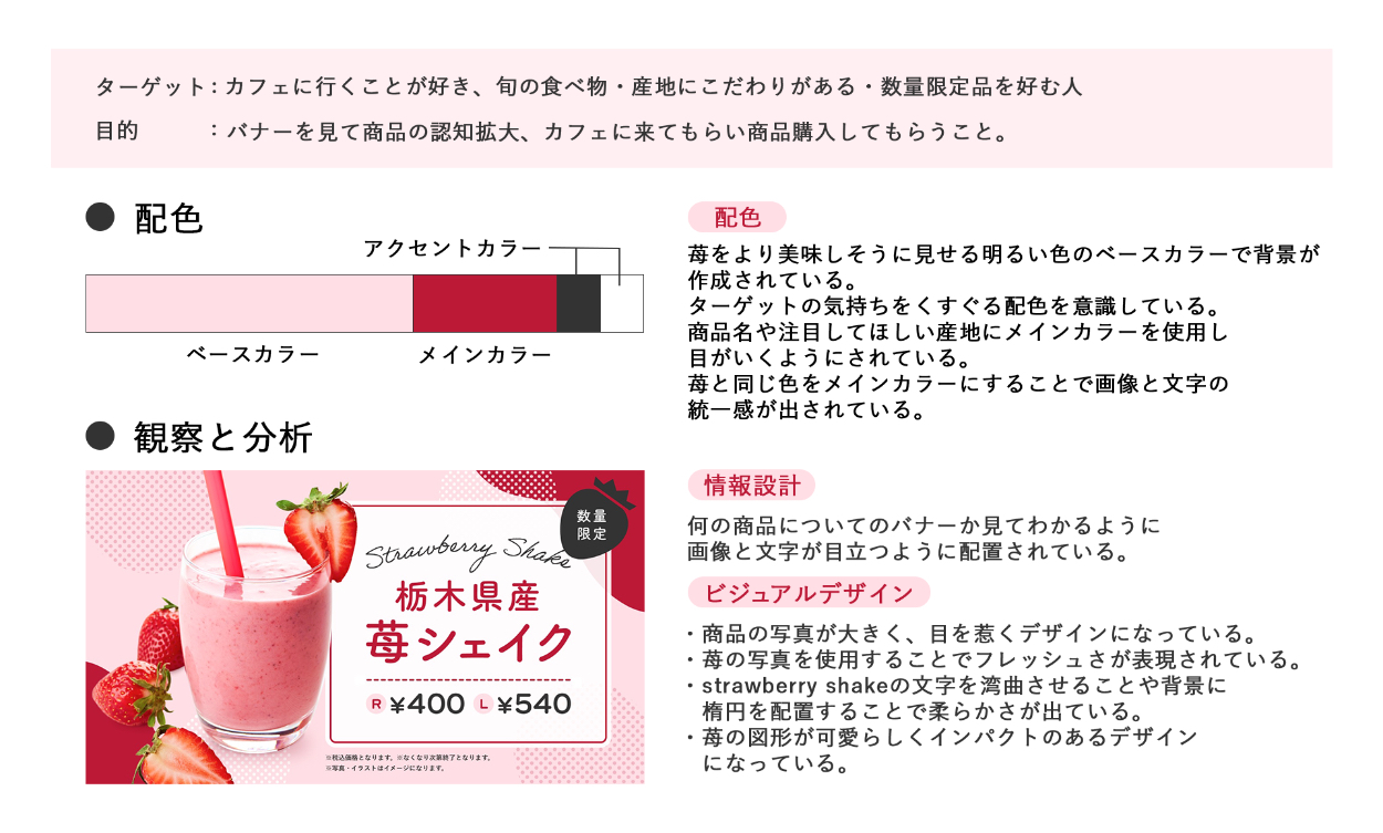 写真や文字の配置、アクセントカラーの割合等、実際にトレースをしてみることによりターゲットの行動を促すための工夫がいくつもされていることに気がつきました。ただ見ているだけではわからなかった細部にまで目を向けることができ、ターゲットに応じた情報設計の重要さを学びました。
