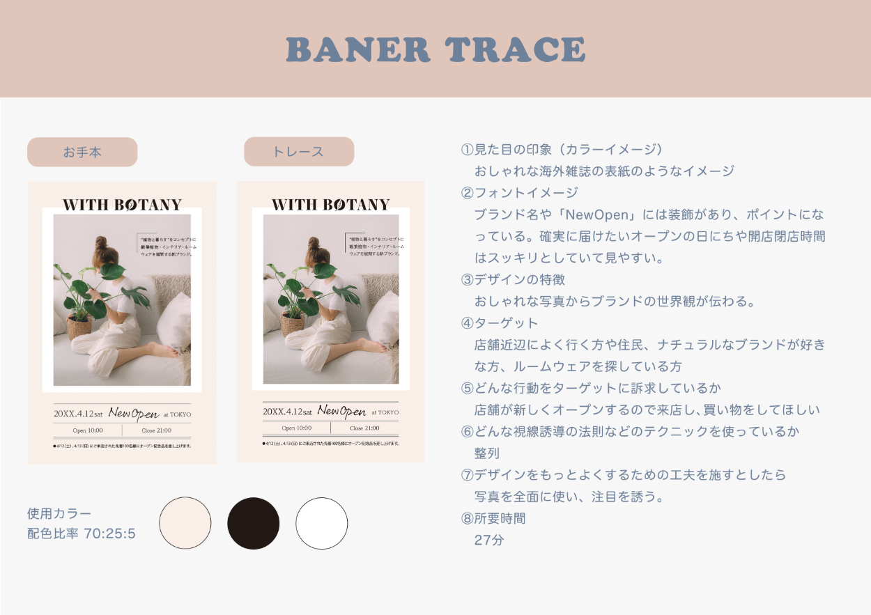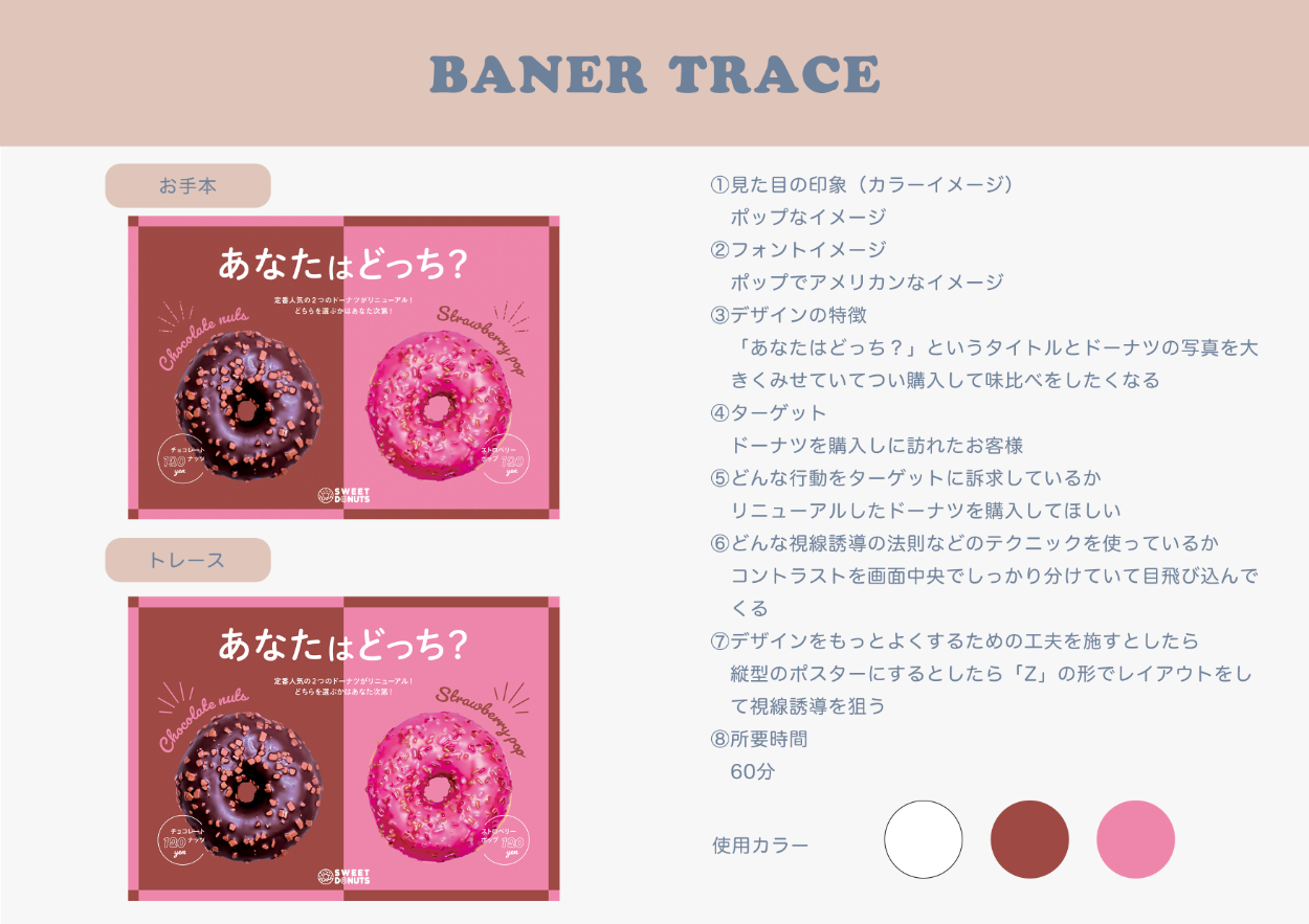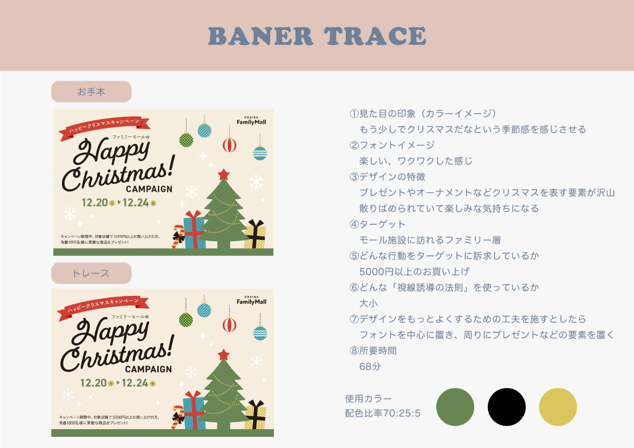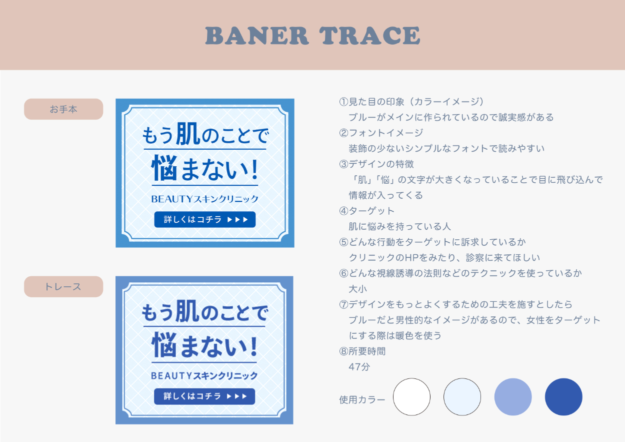 バナートレース Miku u. フリーランス、転職を目指して勉強しています🦭 OVERVIEW 書籍「トレース&模写で学ぶ デザインのドリル」を用いて、バナーをトレースしました。 Photoshopで制作し、ターゲットなど分析したものをまとめています。 YEAR 2024