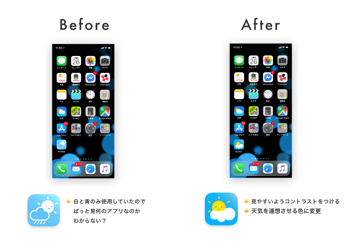 ホーム画面に並べてみると何のアプリなのかよくわからなかったので、一目で天気アプリだとわかりやすいようにはっきりした色使いに変更しました。