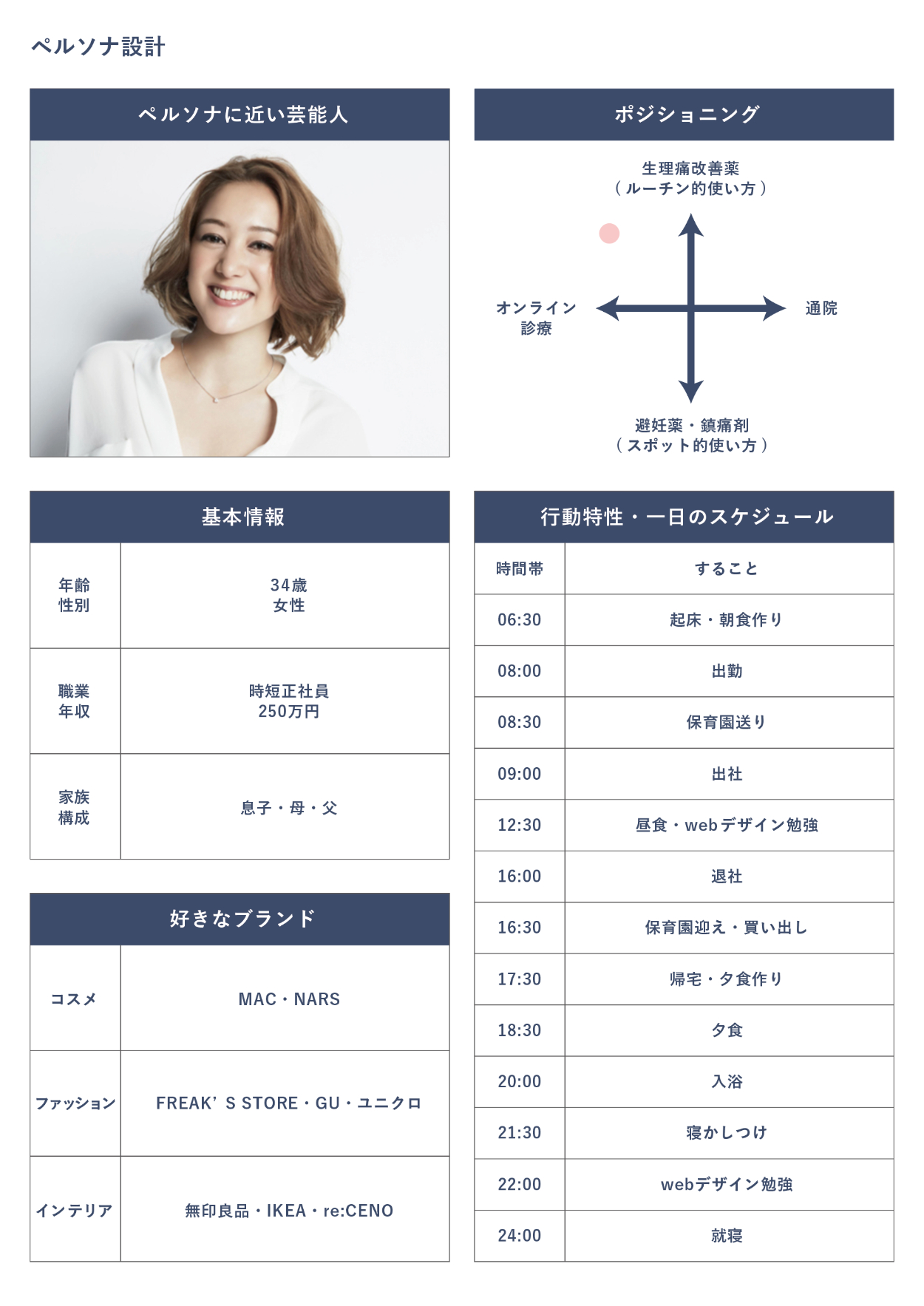 mederi様から「女性にもっと生理痛やピルなどの正しい知識に興味を持ってもらい、QOLを高めるための選択肢の一つとしてピルを知ってほしいが」と伺ったことから、私自身の状態がまさしくそれに近しい状態であったため、私自身をペルソナに設定し、自身の思考と感情に向き合い分析に役立てました。