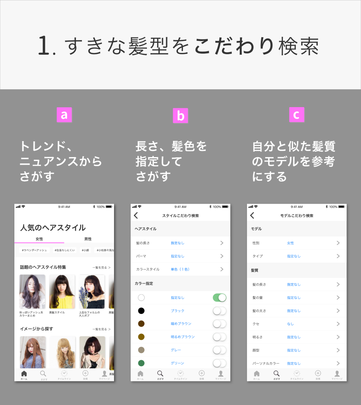 (※ また、髪質に絞って記載していましたが、自分に似たモデルから探す、という観点で、髪質だけではなく顔型・パーソナルカラーも選べるように設計しています)