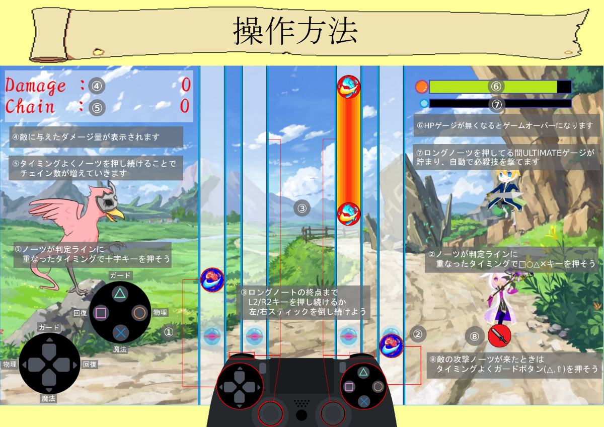 攻撃や防御、回復などの行動を盛り込んだ新感覚音ゲー