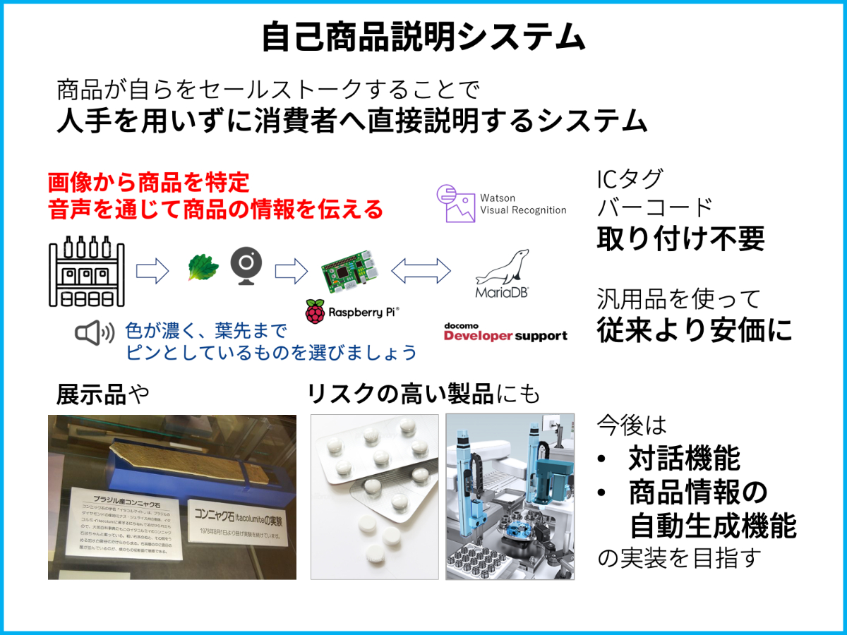 画像認識で商品を特定し、商品が自らをセールストークすることで、人手を用いずに消費者へ直接説明するシステム。 制作期間は2週間。 企画・設計・実装全てペイシュンマツ
