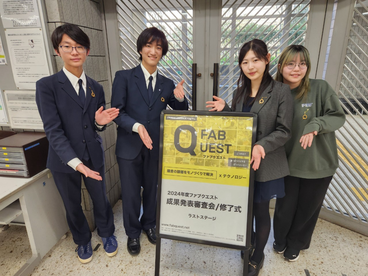 FAB QUEST 2024には、神奈川県・愛知県・福岡県から計9チームが参加し、鎌倉市の社会課題について半年間にわたり研究を重ね、3月に開催された最終審査会では、それぞれのチームが、最優秀賞・審査員特別賞の合計4賞を目指して発表を行いました。私たちのチームが公式の賞を受賞することはできませんでしたが、来場者による一般投票で2位という結果をいただくことができました。