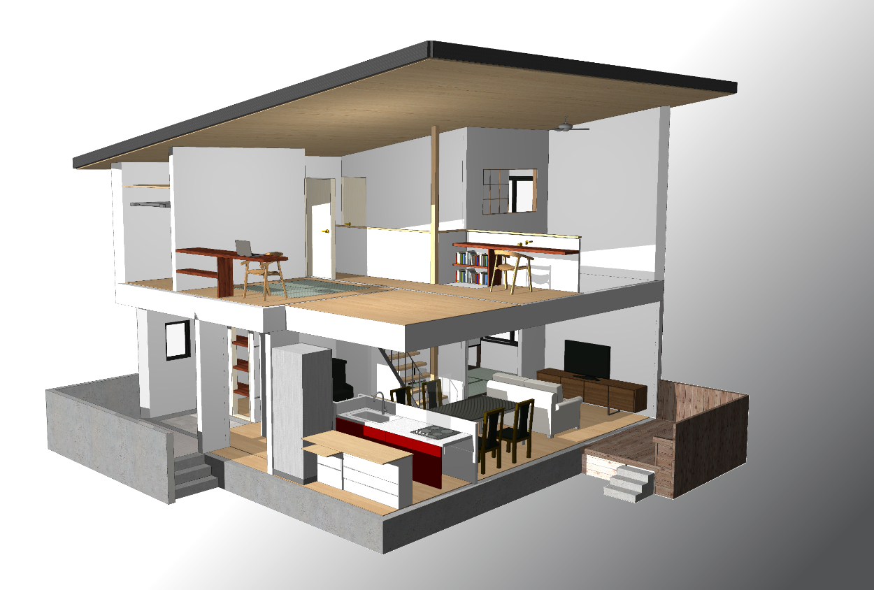 六甲山麓に計画提案した3人家族の住宅。ご夫婦でリモートワークが多く、2階に専用の書斎を設けてプライベートと仕事の両立ができるようなプランとした。吹抜を用いて1階リビングと2階廊下及び主寝室を繋ぐことで家族の距離を近づけた。