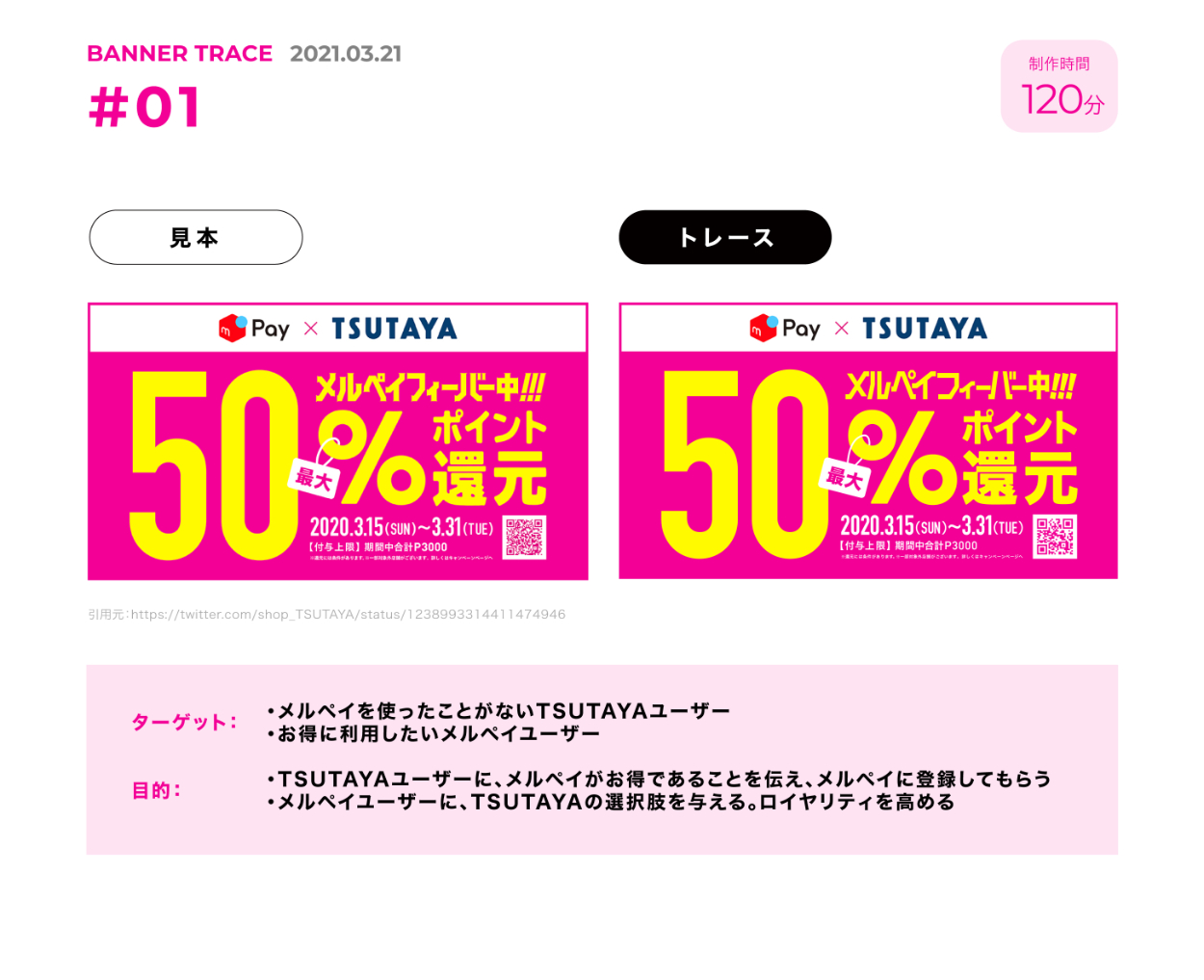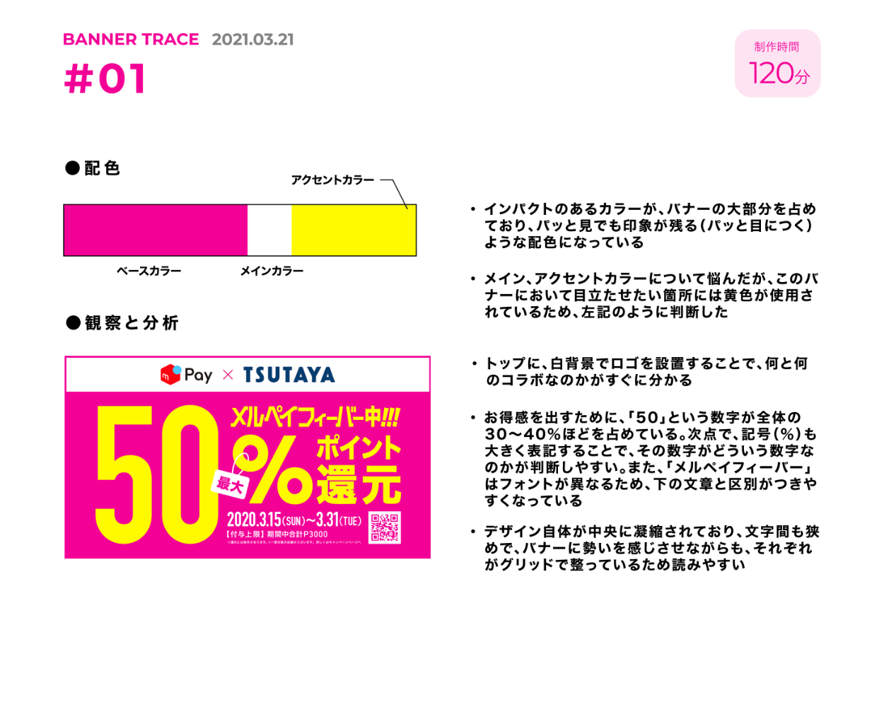 このトレースの際は、すぐに作業に取り掛かったのですが、「全体構成の把握」「配色や工夫について言語化」「再現方法が不明な箇所を調べる」など、バナートレースにすぐ着手するのではなく、大まかに必要な情報を集め、進め方を計画するようになりました。そうすることで、トレースの目的もハッキリとし、作成スピードをあげられるようになりました
