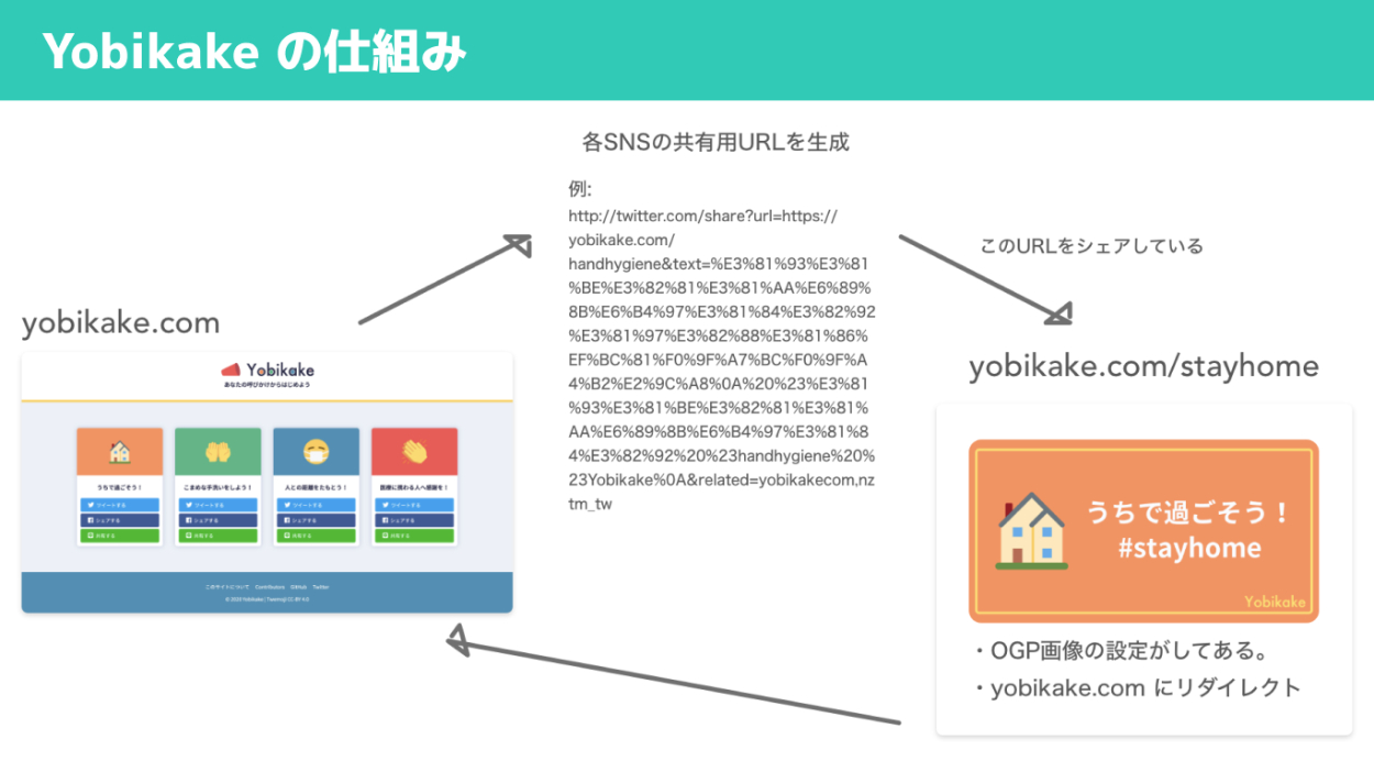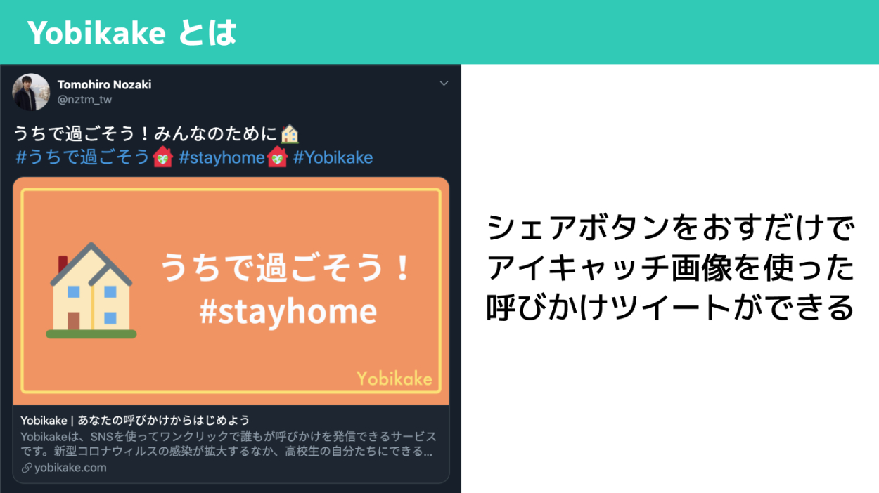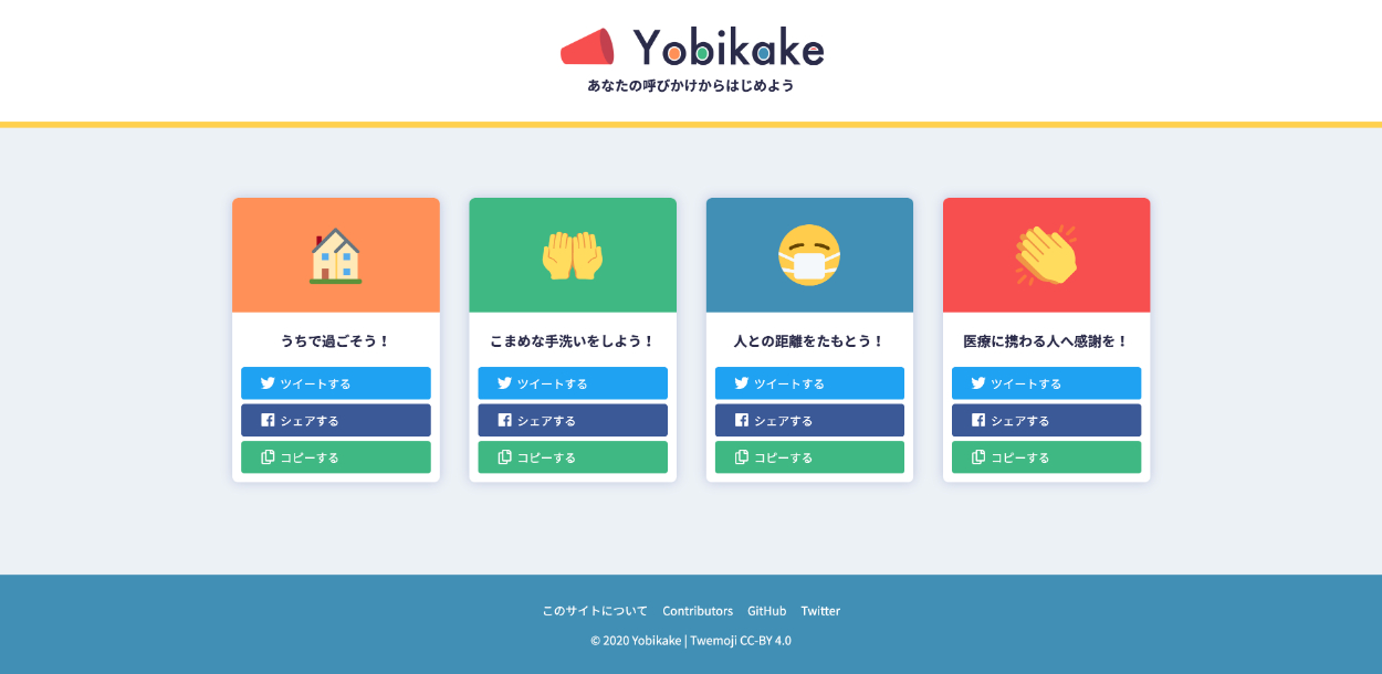 「Yobikake」は、新型コロナウィルスの予防をSNSで簡単に呼びかけることができるサービスです。シェアボタンをクリックするだけで、アイキャッチ画像を使った呼びかけ投稿を作成することができます。