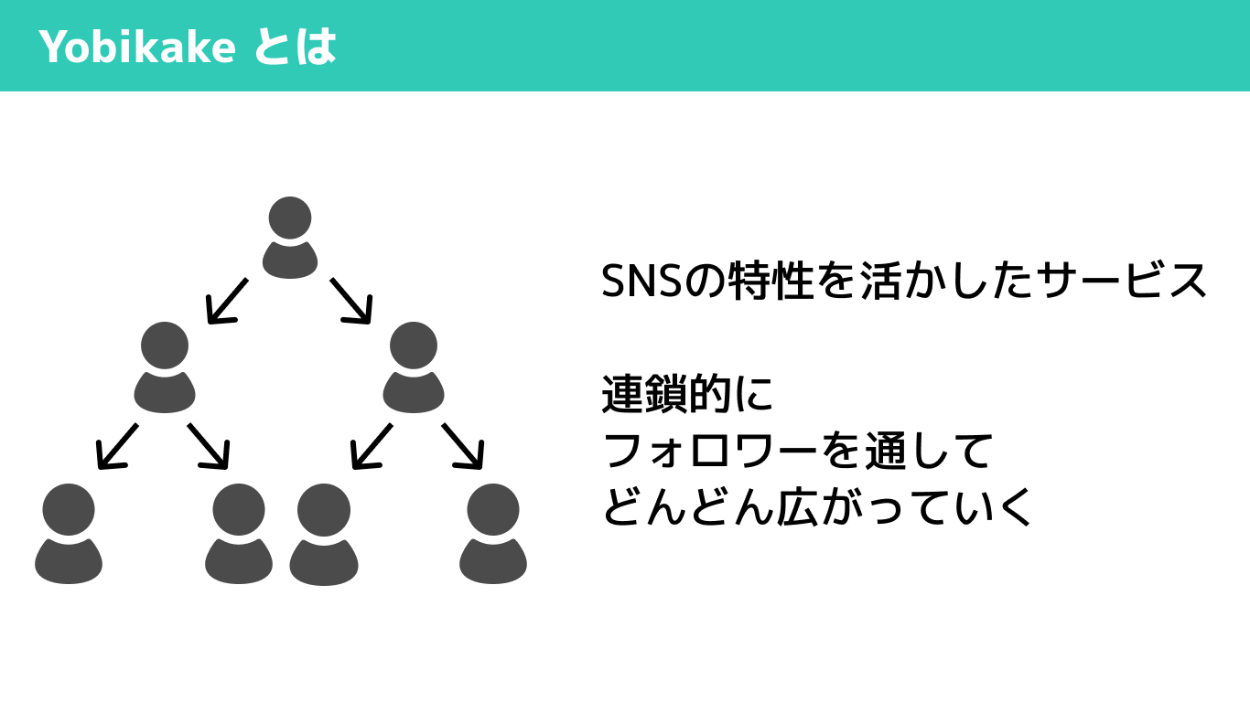 「Yobikake」は、フォロワーからフォロワーへと連鎖的に広がっていく、SNSの特性を活かしたサービスになっています。投稿を見た別のユーザーが、サイトにアクセスしてシェアボタンを押すだけで同じような投稿を作成できるため、多くのユーザーが使えば使うほど、広がり、多くの人に呼びかけを届けることができます。