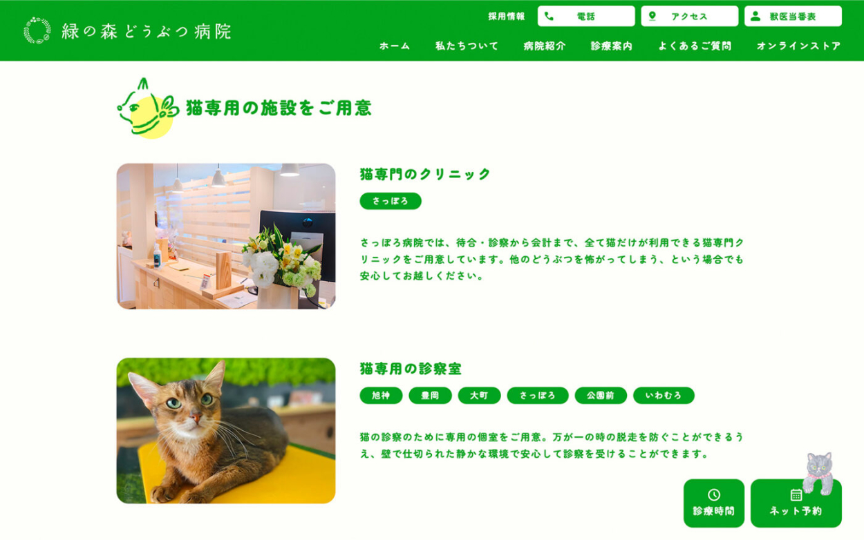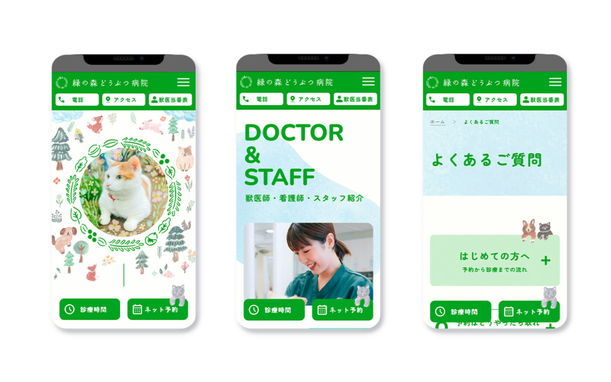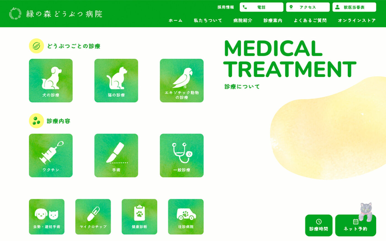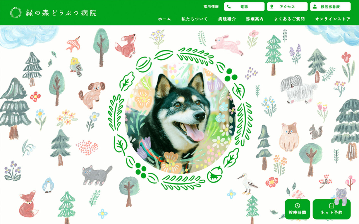 Design | 緑の森どうぶつ病院 MIO UENO デザイナー/イラストレーター/フロントエンドエンジニア OVERVIEW 緑の森どうぶつ病院様のサイトリニューアルをお手伝いしました。 YEAR 2022 緑の森どうぶつ病院様のサイトリニューアルをお手伝いしました。私はデザインリードとして、下層ページ制作、他デザインチームメンバーの制作取りまとめなどを行いました。Web Site