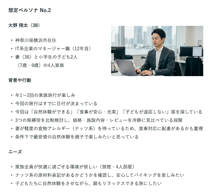 - 想定ペルソナの背景や行動を考慮し、宿泊プランをシチュエーションで分けることで選びやすさを重視しました。