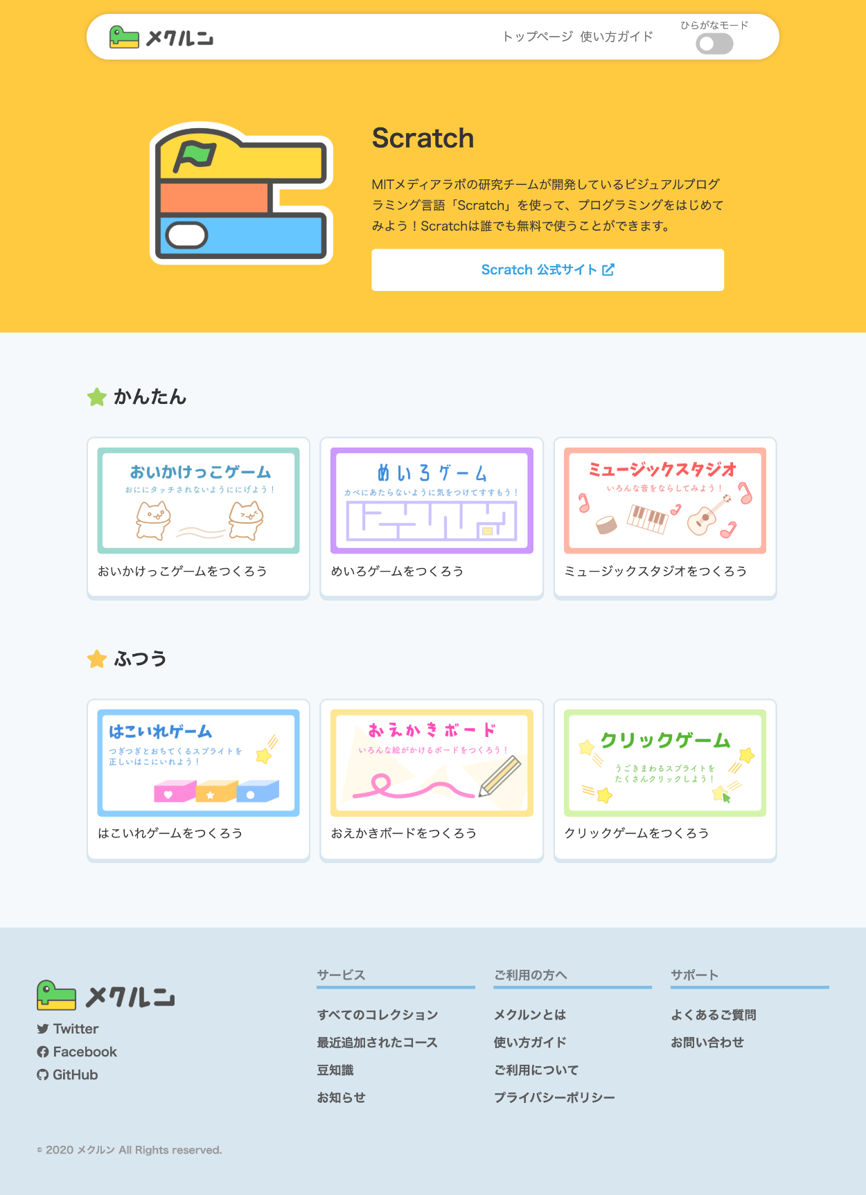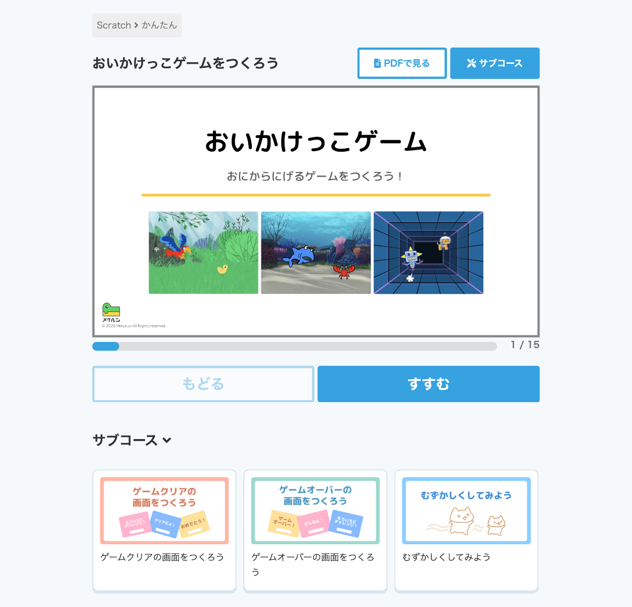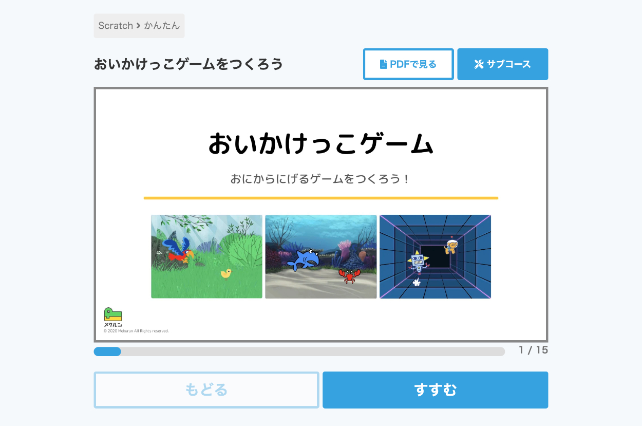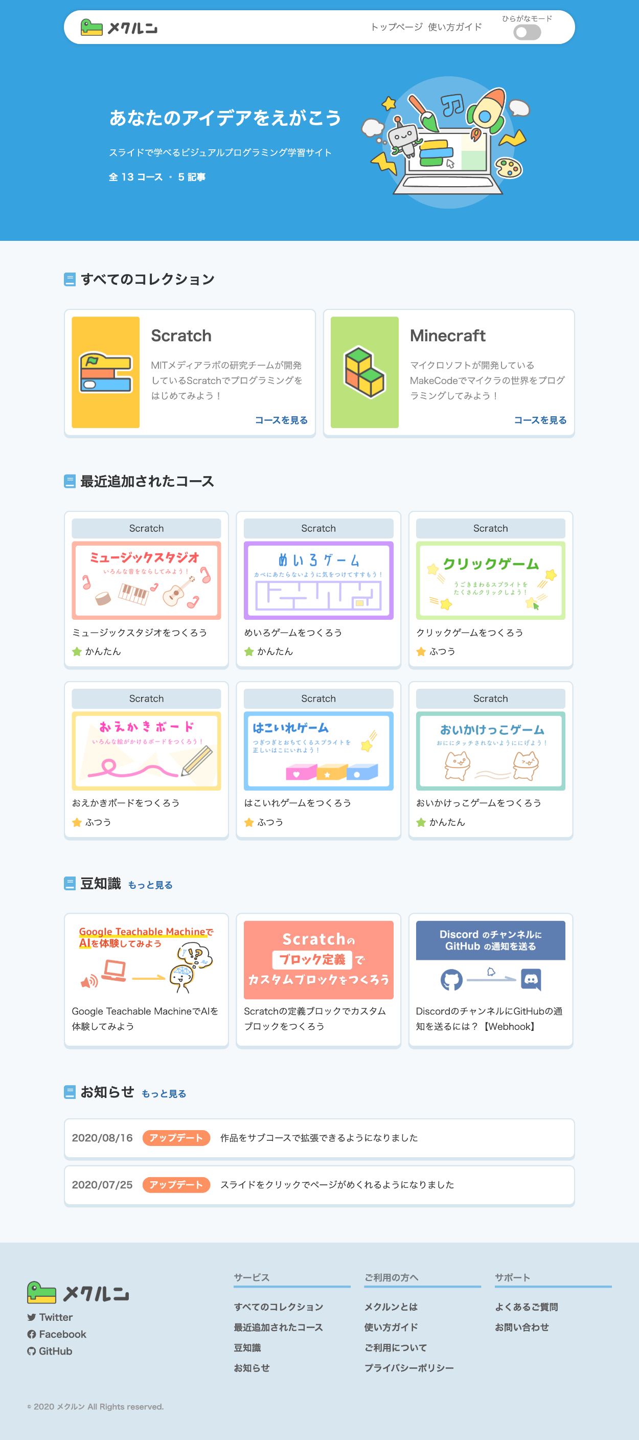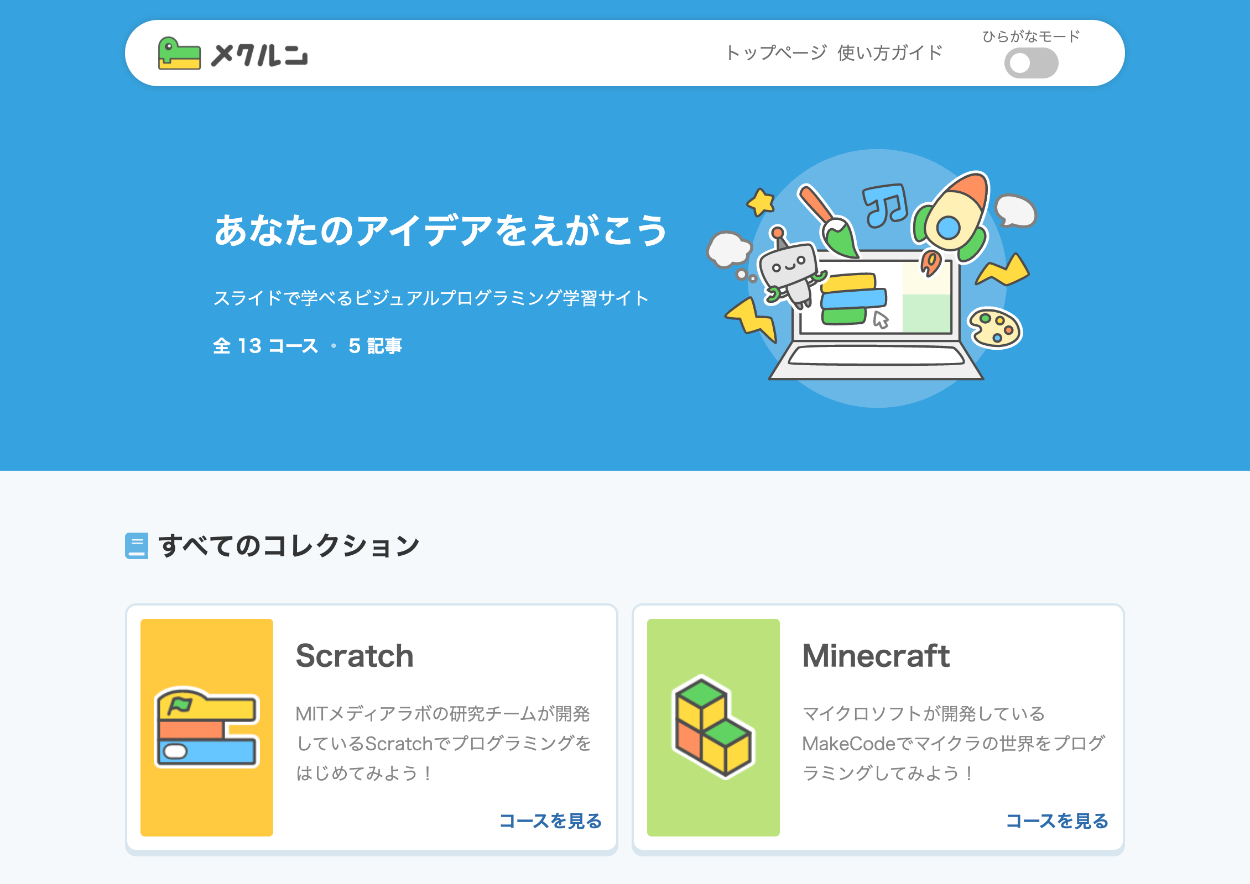 「メクルン」は、スライドで学べる子ども向けプログラミング学習サイトです。ブロックを組んでプログラミングができるビジュアルプログラミング言語(ScratchやMakeCode)を中心に、作品をつくりながら学べる入門コンテンツを提供しています。