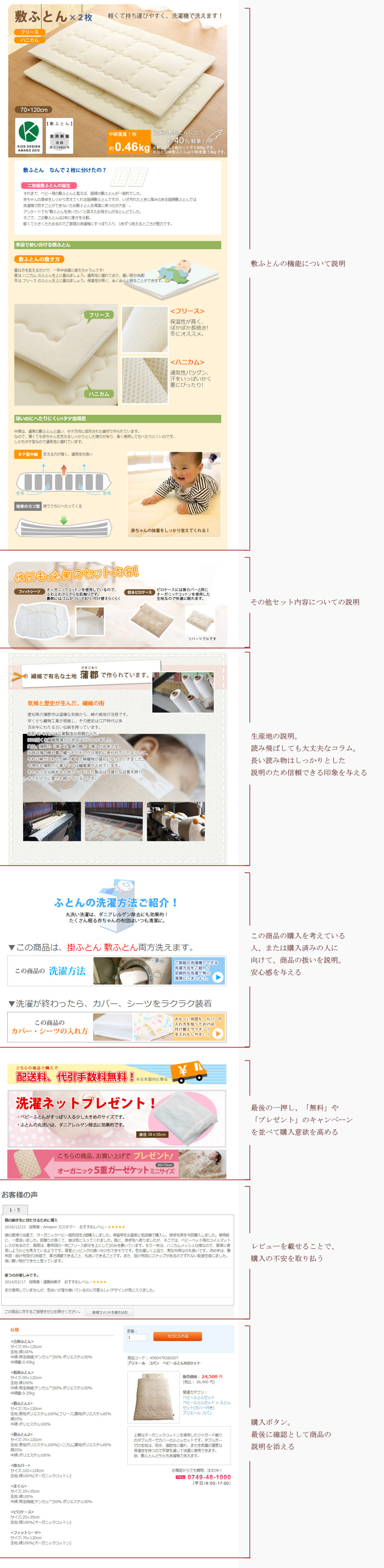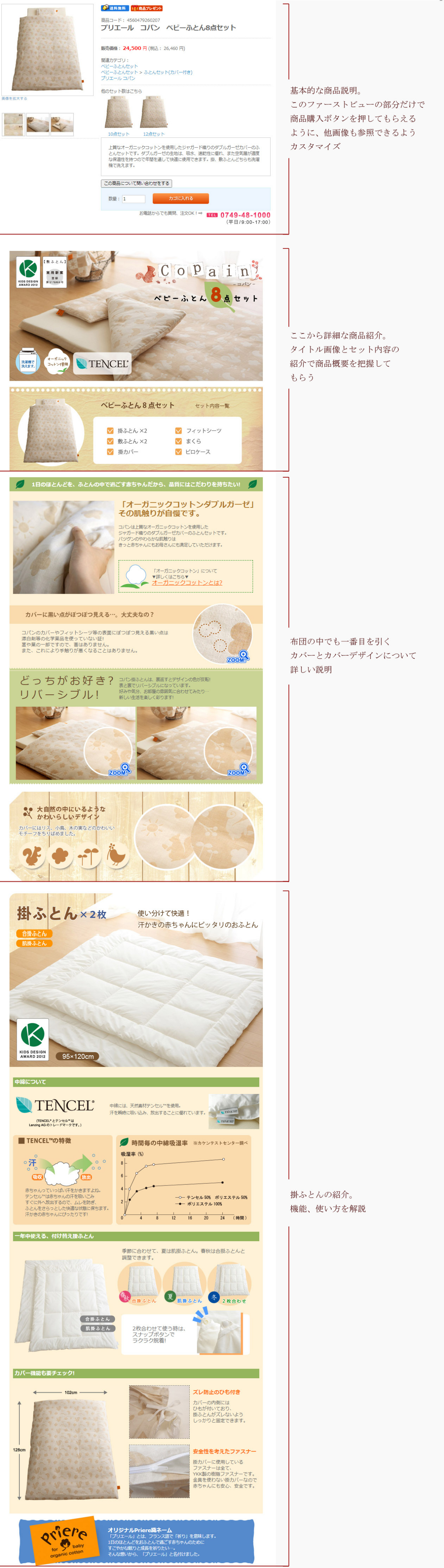 ▼下図は、その商品詳細ページの一例です。画像の右に、気をつけたポイントをまとめました。ほぼこの形式で全ての商品詳細ページを作っています。