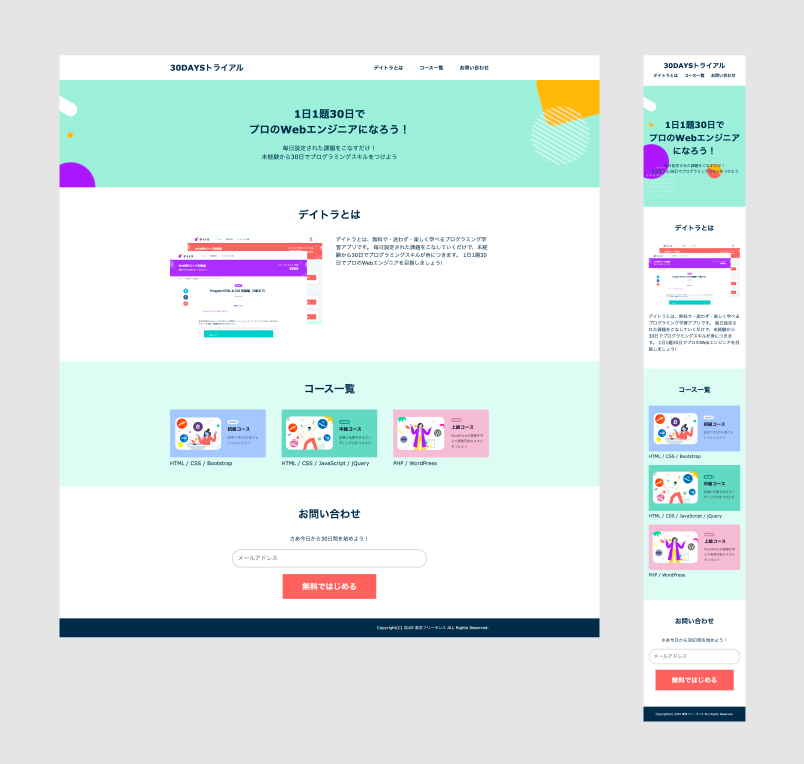 初めてのコーディングでした。完成見本のサイトをパーツごと(ヘッダーやフッターなど)に分解→効率のよいコード記述を想像→再構築の流れで実装を進めました。レスポンシブでfloat解除できなかったり、CSS反映できなかったりと躓く場面もありましたが、なんとかやり切ることができました。