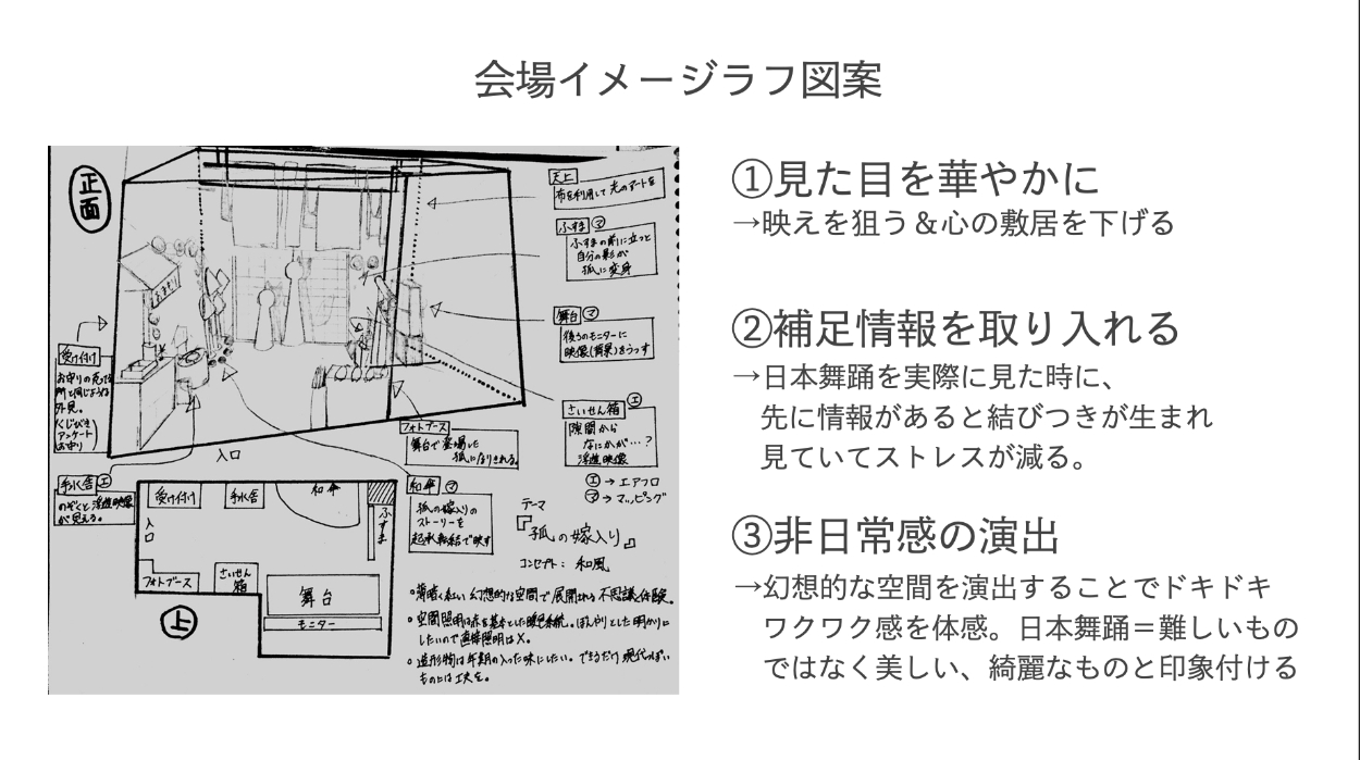 月に2回日本舞踊を習いに行っている中で、曲や踊りの中にあるストーリーの奥深さ・おもしろさを知りました。ご指導いただいている先生から「日舞の面白さを若い人に知ってもらうためにはどうしたらいいだろう?」と相談されたことをきっかけにこの展示会を企画しました。
