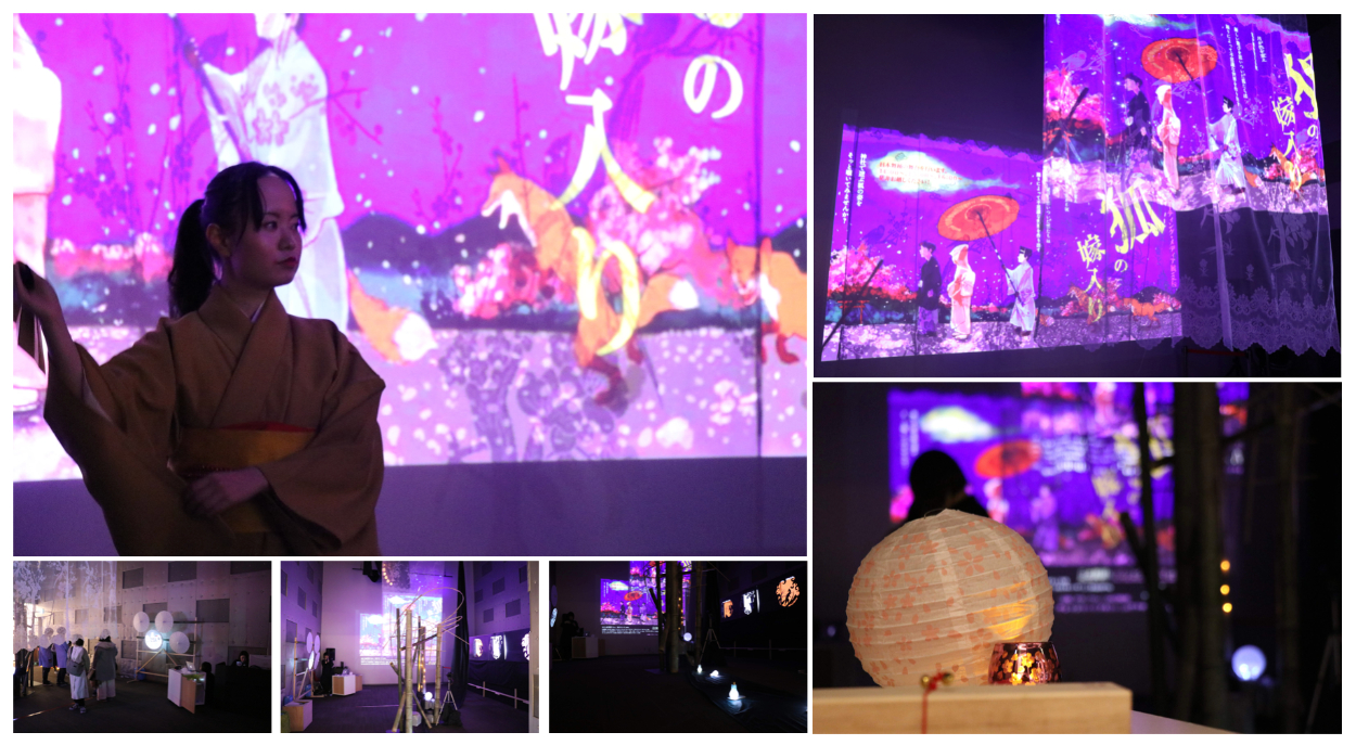 日本昔ばなしの狐の嫁入りのストーリーを起承転結にわけたアニメーションを作成依頼。その動画を笹で支えた4本の和傘それぞれに投影し、狐の嫁入りのストーリーを知ってから日舞を見ていただけるように工夫しました。
