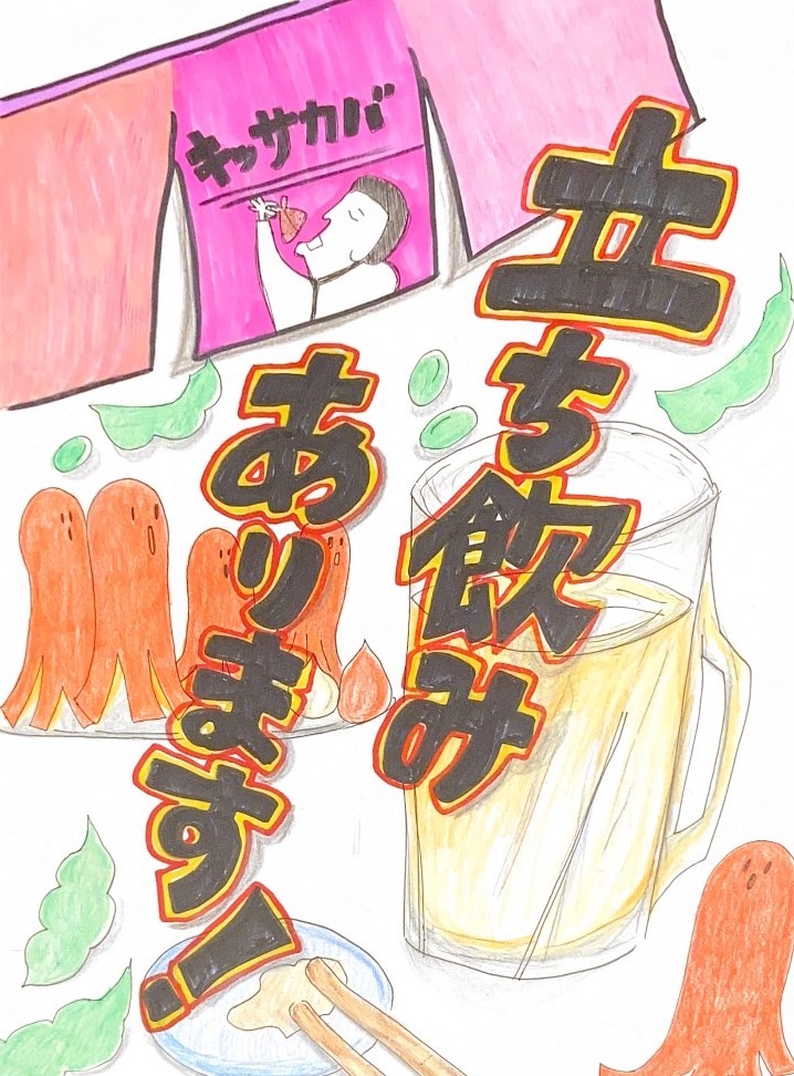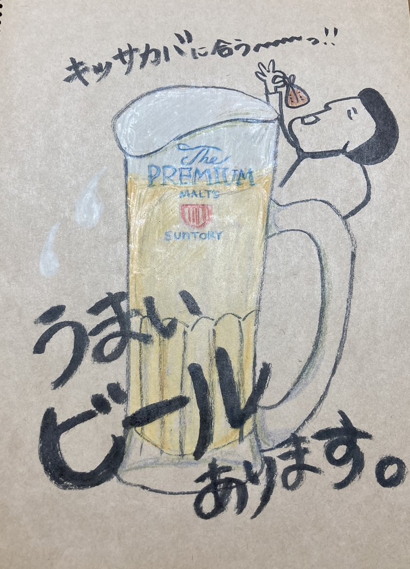 つい頼みたくなるように、ビールのイラストと筆ペンを用いた文字で力強さを出しました!