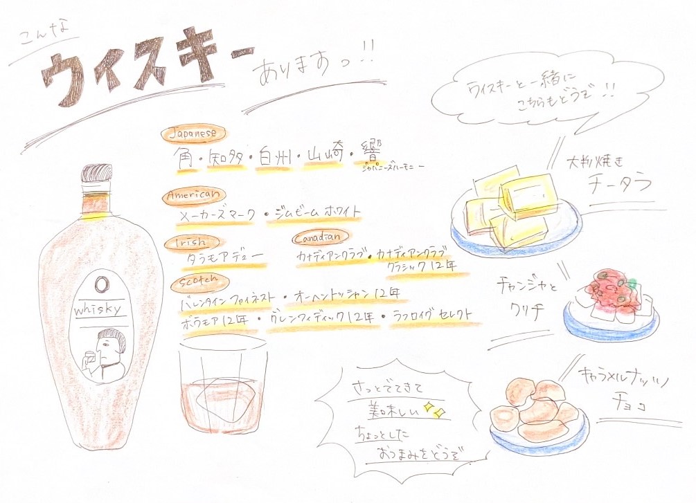 種類で分け、さらにウイスキーに合うおつまみのイラストも添えました!