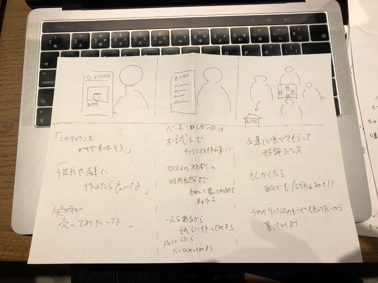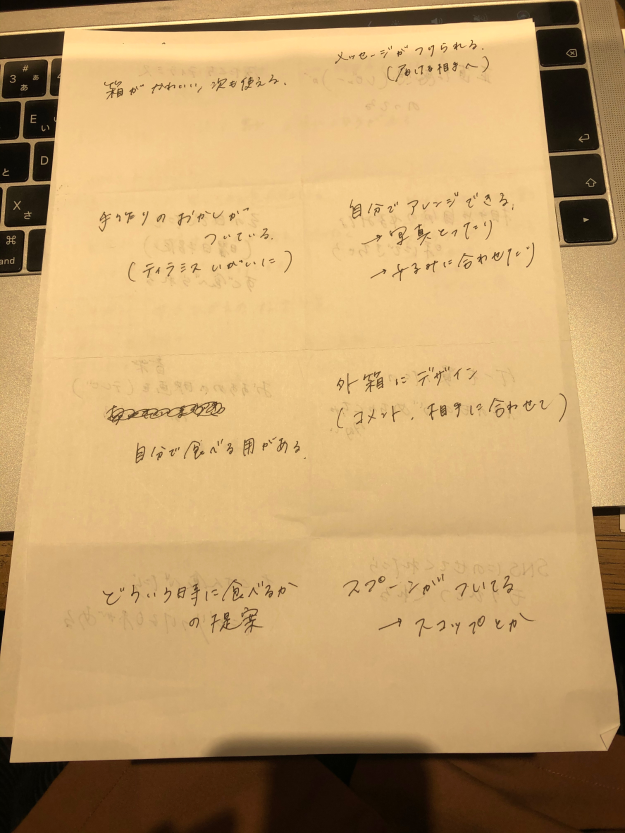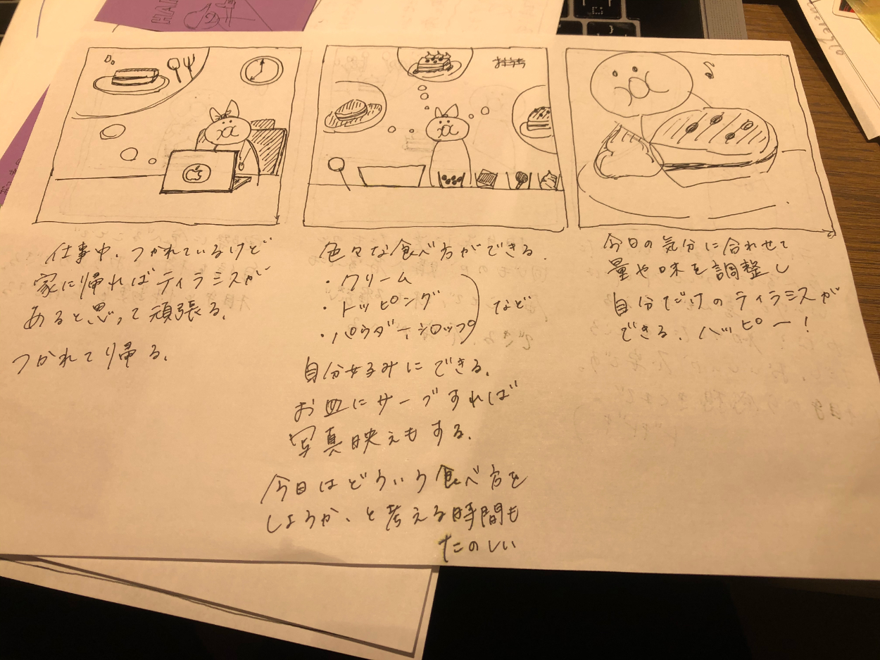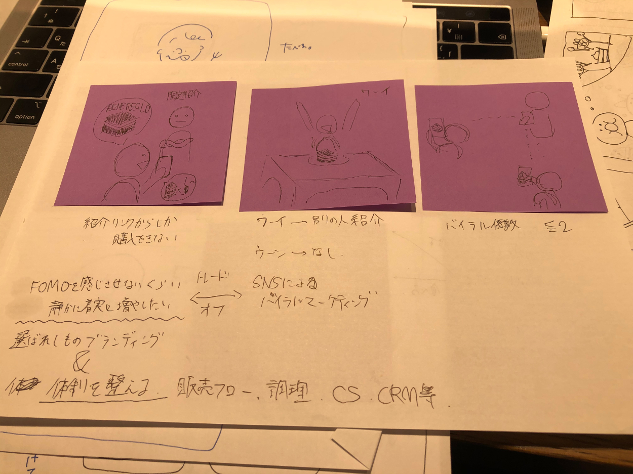 D2Cでスイーツを売る。その場合の体験設計をどうするのかを議論していた。 その折に、Design Sprintの発散フェーズを実施することになった。