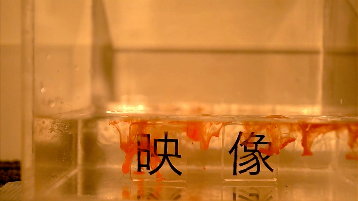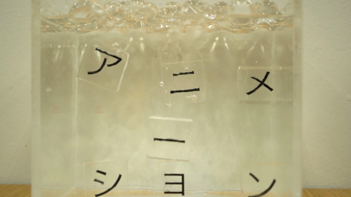 この作品では「現実で透明感を利用すること」を目的としている.水の中で透明感を出すために,吸水ポリマー(消臭ビーズ)を使うことにした.吸水ポリマーが水を吸うと,その時間が長いほどサイズが大きくなる.時間差で大きさが変わることを利用して,様々な時間で水を吸わせてランダムなサイズの吸水ポリマーを生成した.吸水ポリマーは水とほぼ同じ屈折率になるので,水の中ではほぼ見えなくなる.しかし,光の反射で輪郭が光ったりして少し見えるが,これは視聴者に何かあると思わせる表現でもある. この微妙な塩梅の透明感とランダムなサイズを利用して,透明になった瞬間に見えなかったモノが見えるようになり,見えないモノにぶつかってランダムな方向に進んでいく,という表現をしている.学部3年次の講義: 映像・アニメーション表現の個人課題制作物.