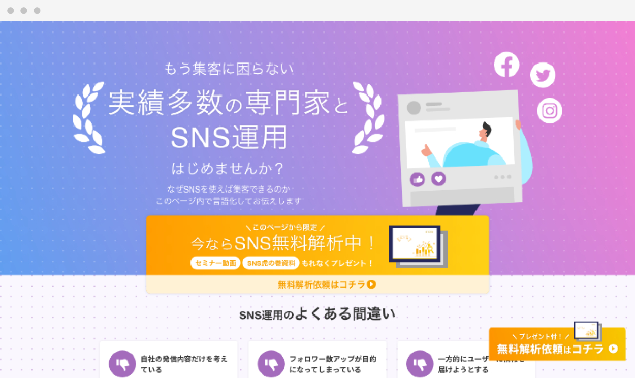 ベイスの持つサービスのひとつである「SNS運用コンサル」のランディングページをリニューアル制作しました。