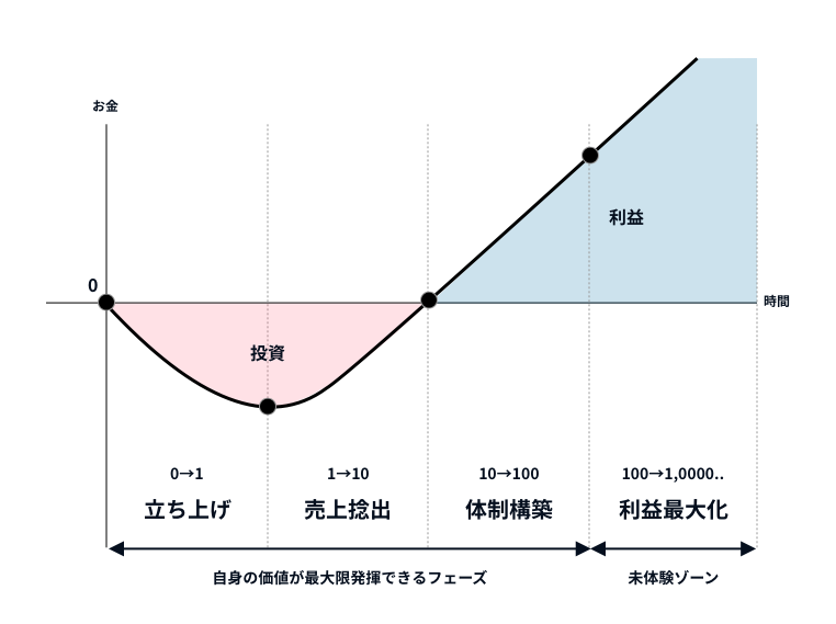 その中でも、ジェネラリストである自分が一番価値を出しやすいのは、「0→1」の立ち上げ部分や、「1→10」の売上捻出、「10→100」の体制構築の部分となります。