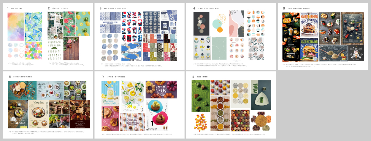 ・トンマナの制約がなかったため、はじめは自分が好きなもの〜6curryの他のデザインに似ているものなど多様に集めました。そこから、自分なりに方向性を定めていきます。