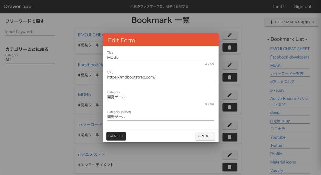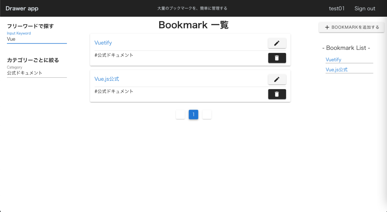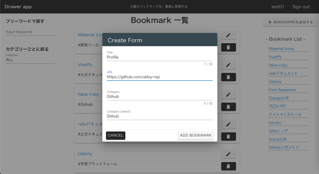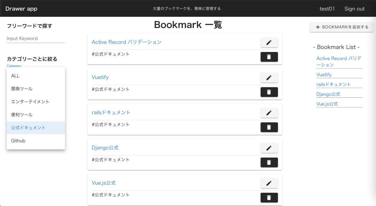 ネット上のwebサイトのリンクをブックマークとして簡単にカテゴライズして保存し、速やかな検索を実現し作業効率の向上を目指して開発した、シングルページアプリケーションです。