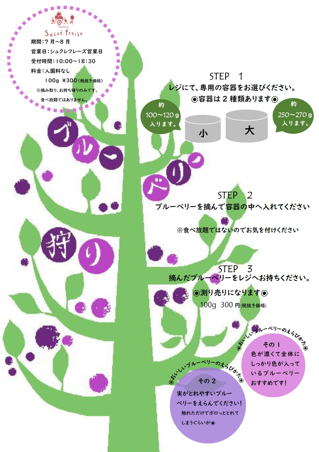 sucre fraise ポップ 石橋泉 OVERVIEW 店内で使うポップの作成 YEAR 2018 - 2020 ブルーベリー狩りの案内お会計までの流れをできるだけわかりやすく説明できるように作成しました。よく聞かれるブルーベリーの選び方などのアドバイスもいれました。定休日のカレンダーExcelの数式を使用して作成カレンダー用に作成したロゴ