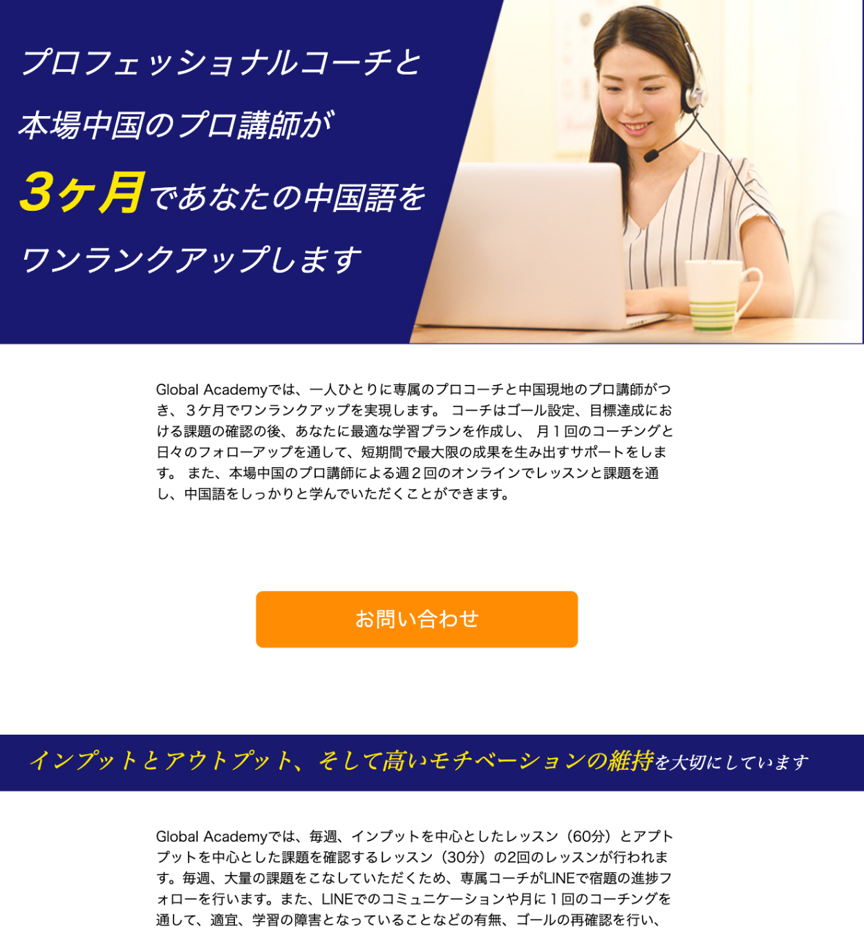 グローバルアカデミー様新規サイト作成 nakajima yuri webデザイナー(独学中) 青、黄色を基調として信頼感のある真面目でシンプルなサイトになるように、構成、デザイン、コーディングまで行いました。
