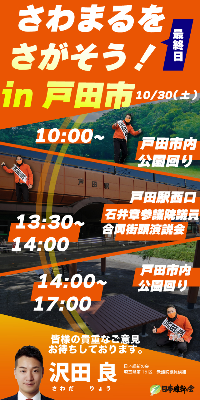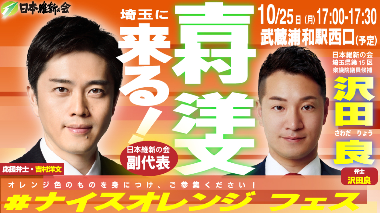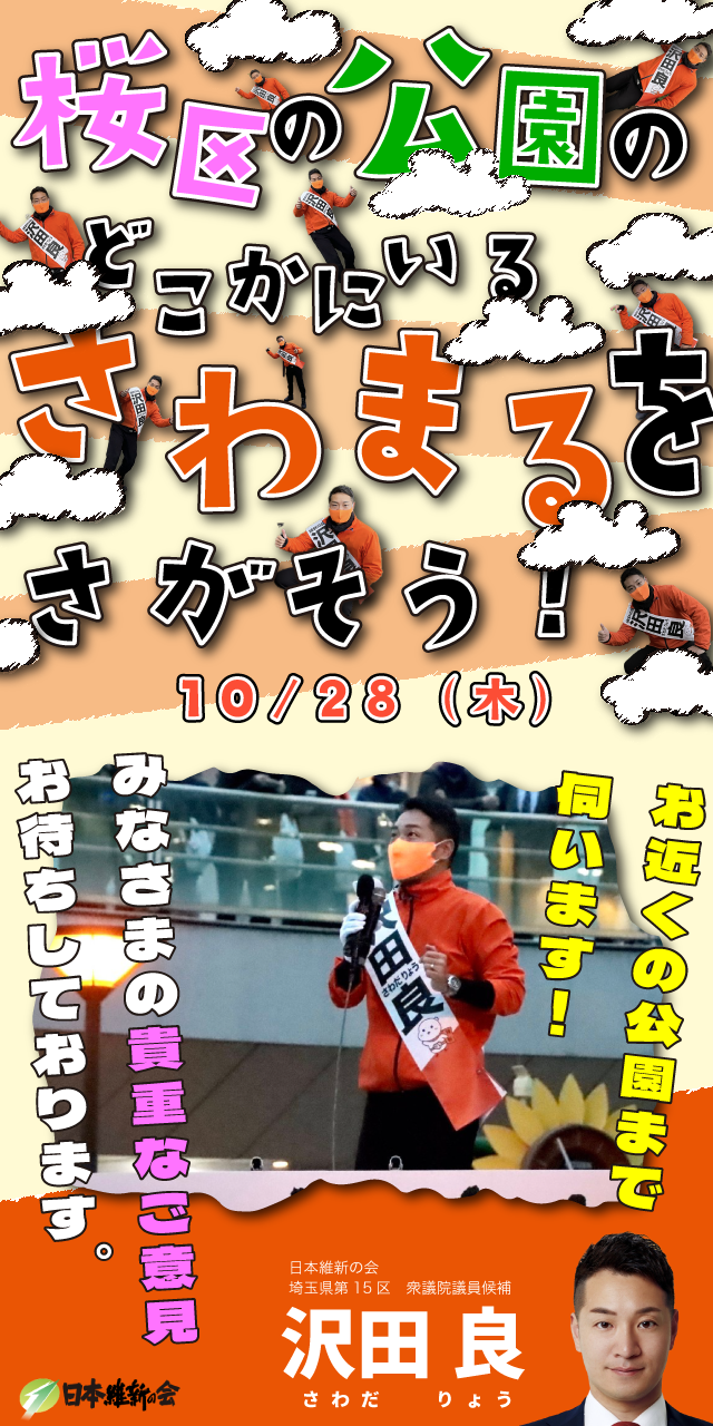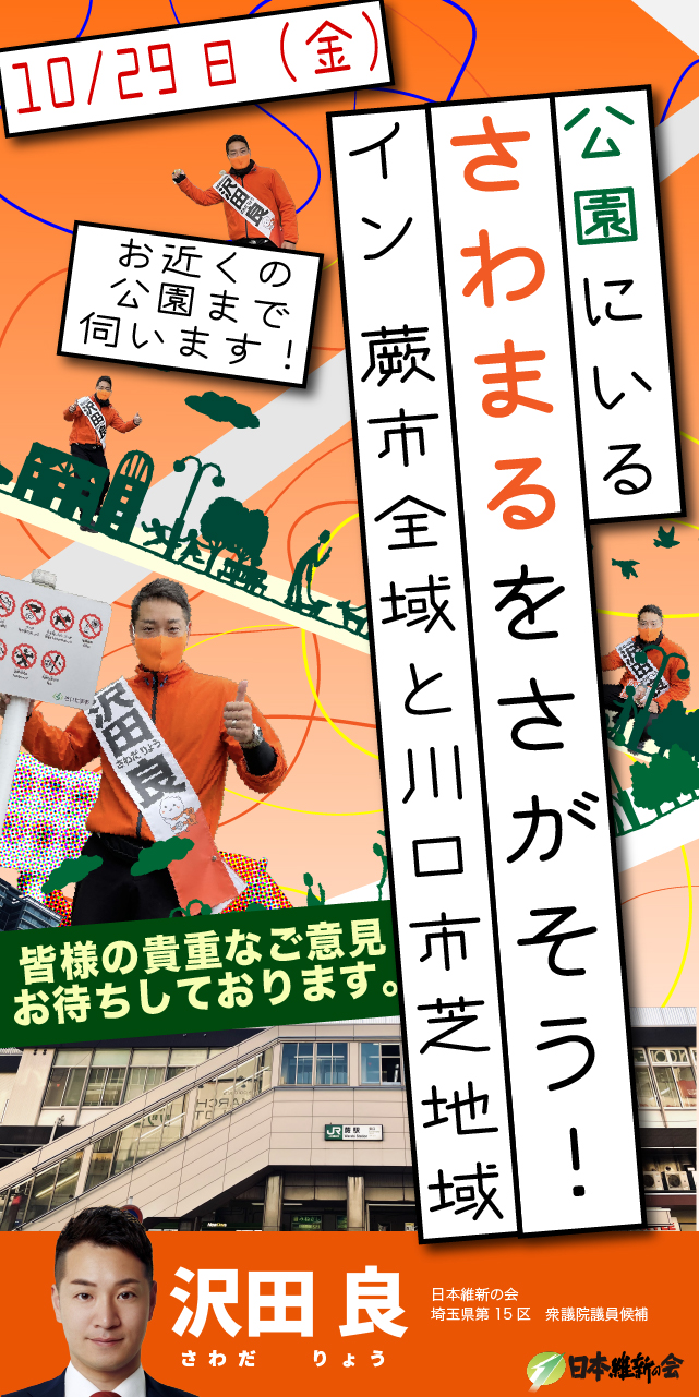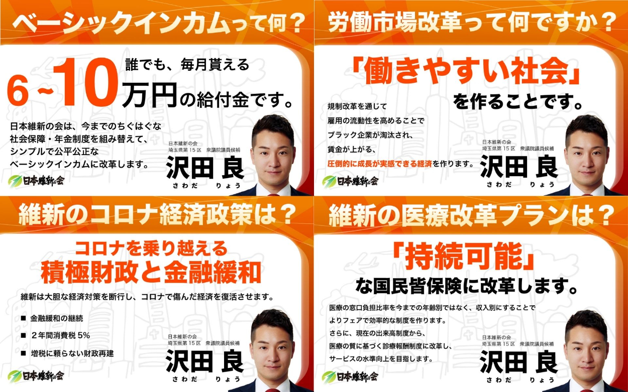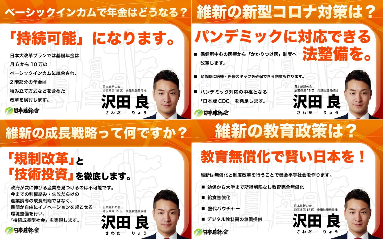 2021年衆議院議員選挙(投開票日:10月31日)で埼玉15区から立候補された日本維新の会・沢田良さんのTwitter広報グラフィックの作成を担当いたしました。
