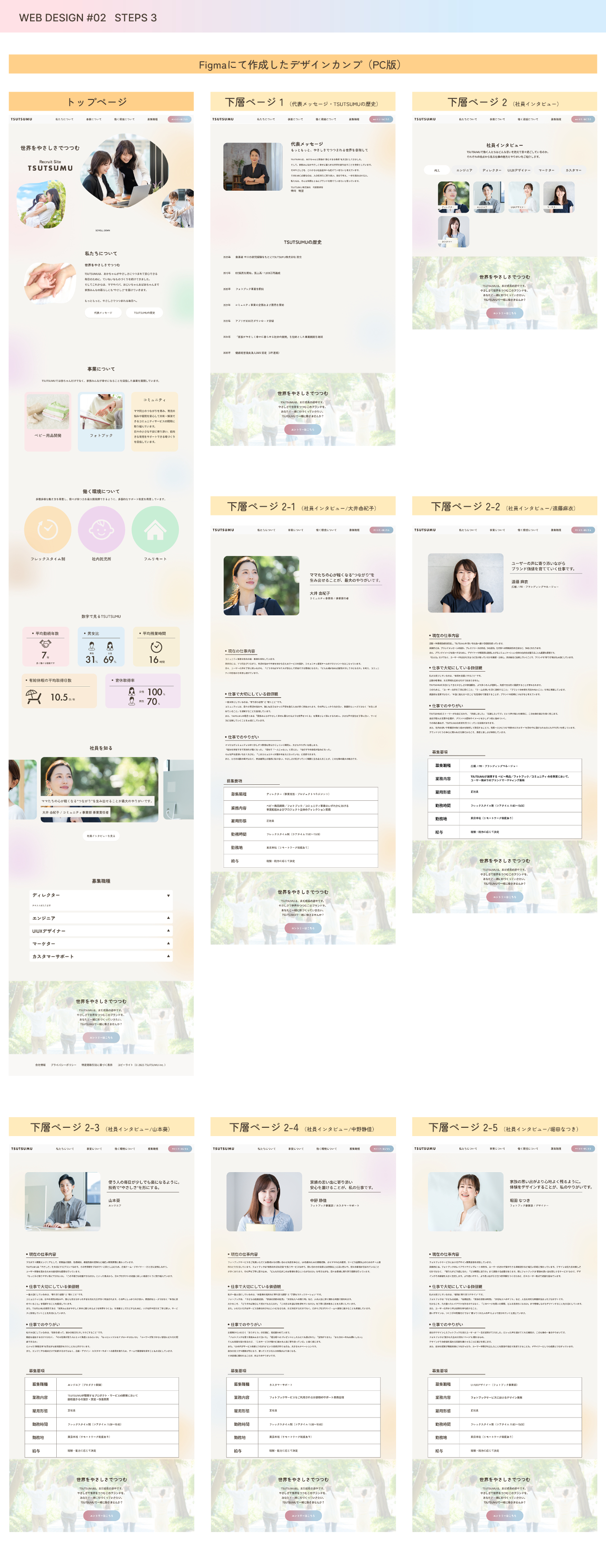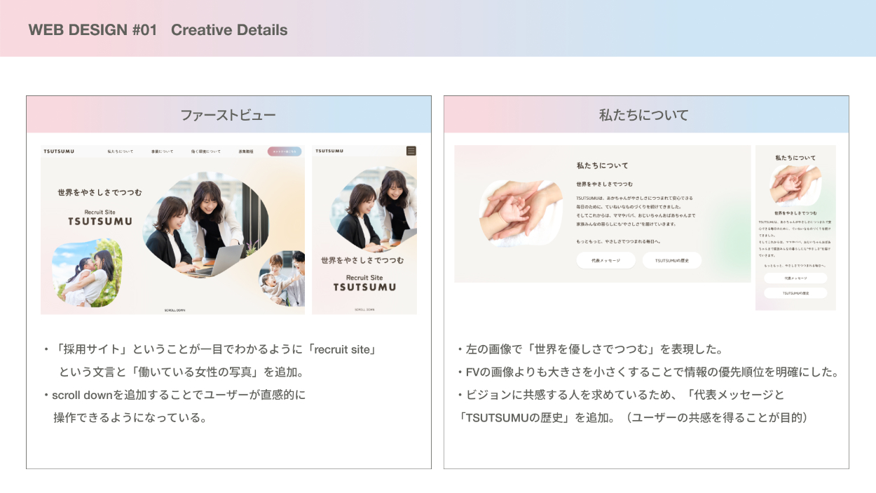 色・フォント・写真などの世界観を統一し、企業の「やさしさ」「誠実さ」が直感的に伝わるデザインにしています。