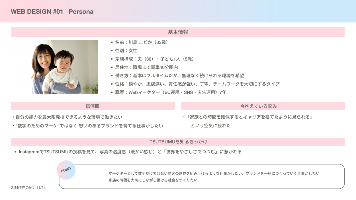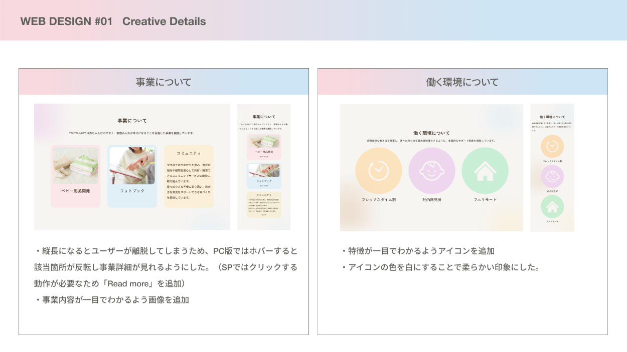 1)「親しみ」「家族」「優しさ」を表現するため、家族の写真・笑顔の写真を多く使用