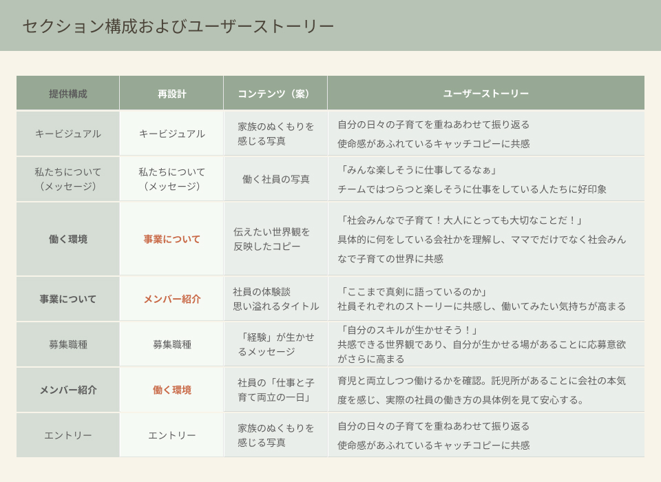 ・共感 → 理解 → 自分ごと化 → 不安解消 → 応募の流れを軸に再構成し、「働く環境」、「事業について」、「メンバー紹介」の順番を入れ替えました。
