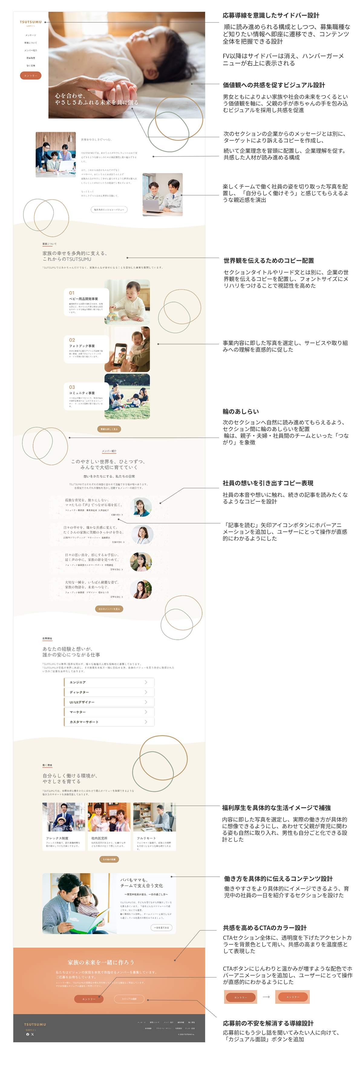 ・キービジュアルで企業の価値観に触れてもらい、事業紹介で理解を深め、メンバー紹介や働く環境のセクションで「ここで働く自分」を具体的に想像できる設計としました。