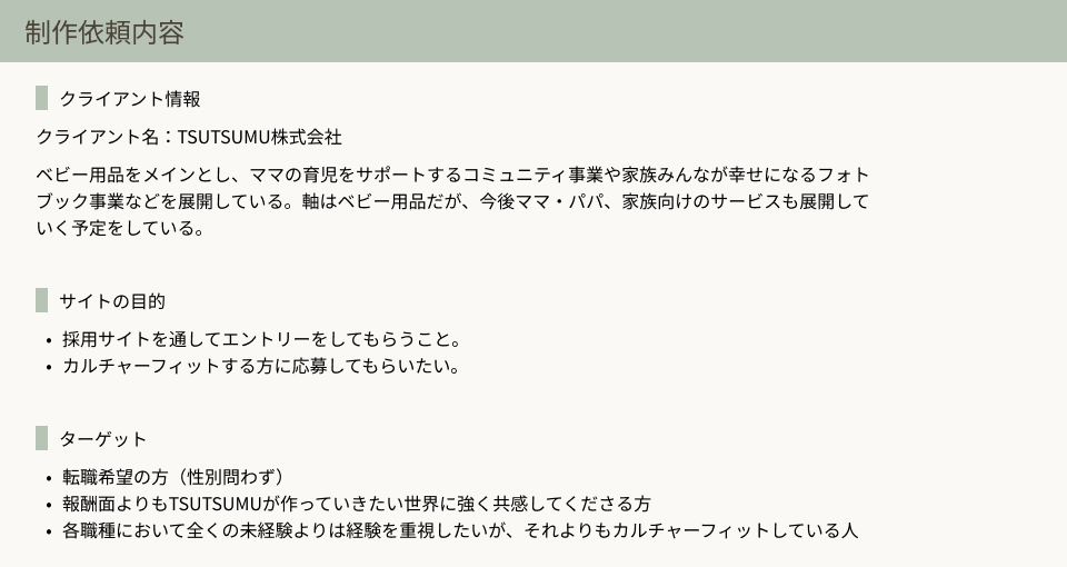 SHElikes PROデザイナーコースの実践課題にて、架空のベビー用品企業採用サイトを制作しました。クライアントの要件書を元に、情報設計、ワイヤーフレーム、デザインカンプ、コーディング、サーバーアップまでを取り組みました。