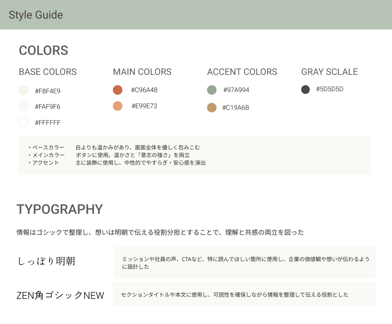 ・知的で落ち着いたプロフェッショナルな印象を目指し、装飾を抑えた余白設計と低彩度の配色でトーンを統一する