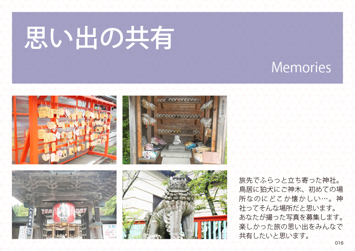 四季折々のそれぞれ違った姿、神社での思い出、それぞれの思いを皆で共有できたらと思います。