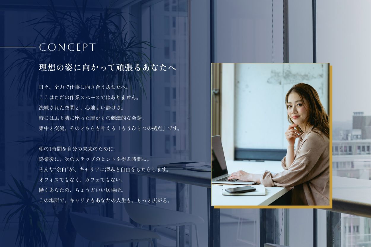 - 窓際のお席から見える景色を背景に使用し、「理想の姿に向かって頑張るあなたへ」というメッセージと重ねながら、施設の利用イメージを想像していただけるように意識しました