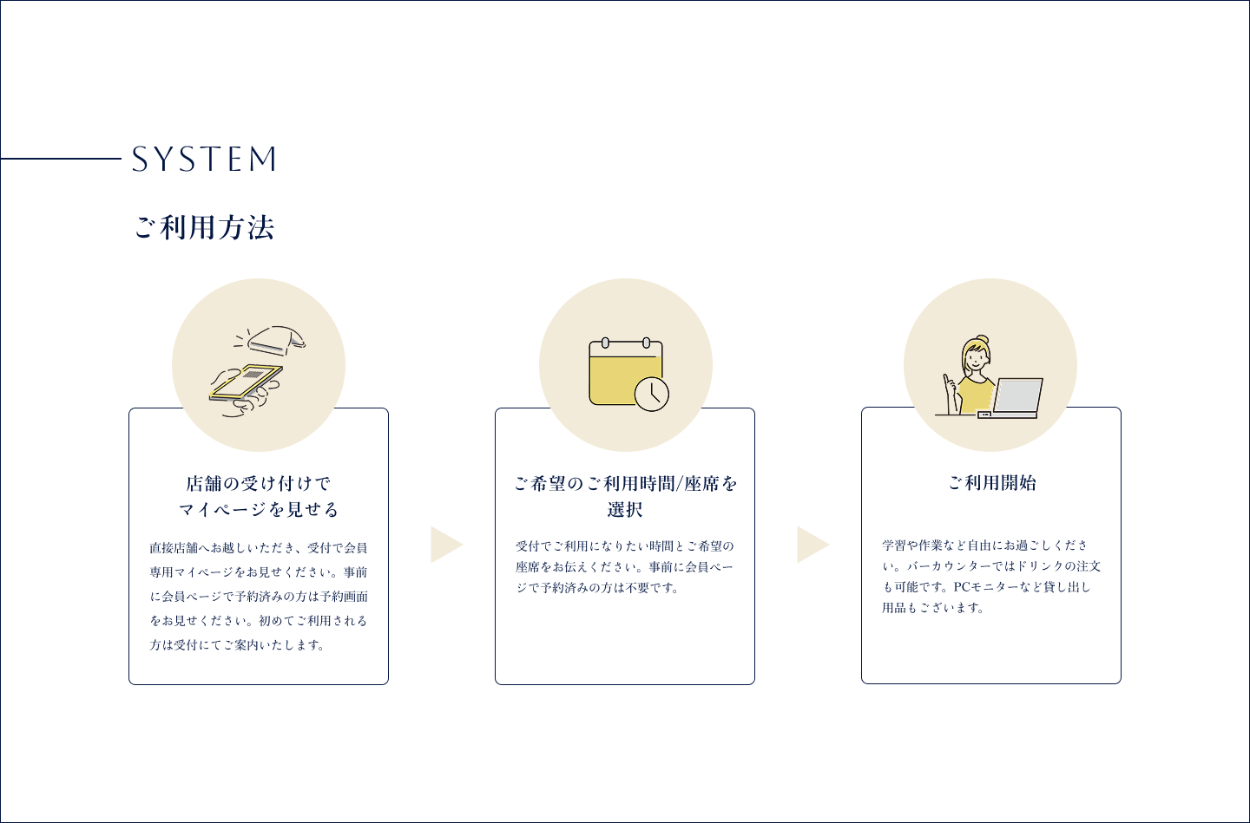 - 来店時の利用の流れはとてもシンプルなので、3つのフローを図式化しました