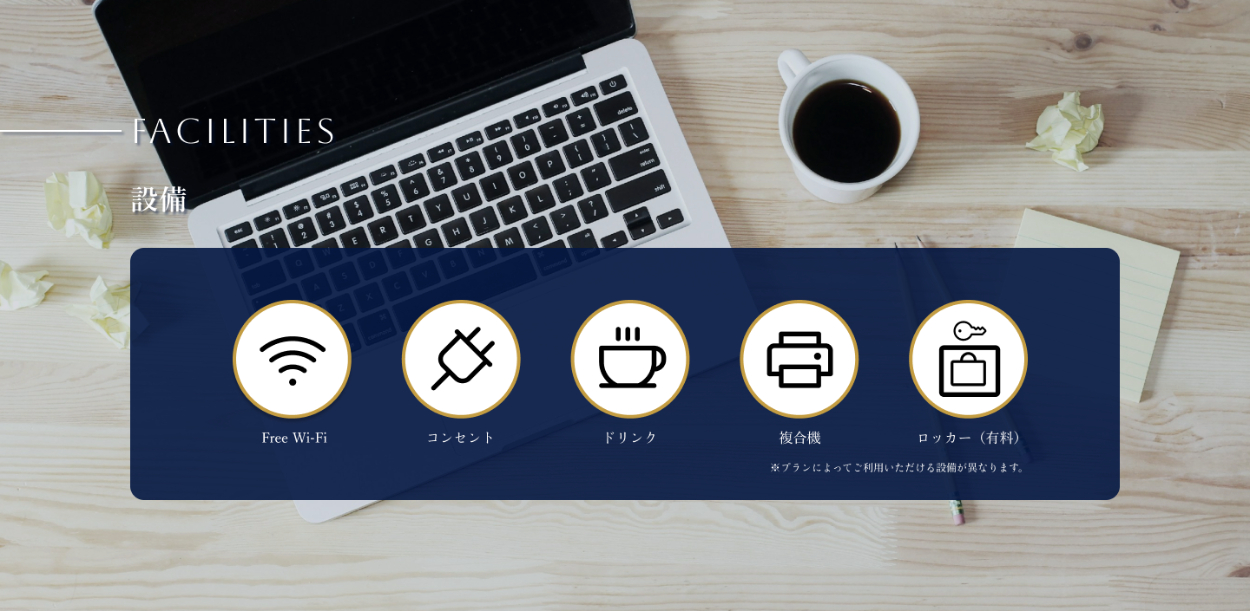 - コンセプトや施設内の3つのエリアの情報を見て、実際に利用してみたいと考えるユーザーは、設備面が気になるのではと考え、FACILITIESセクションを入れました