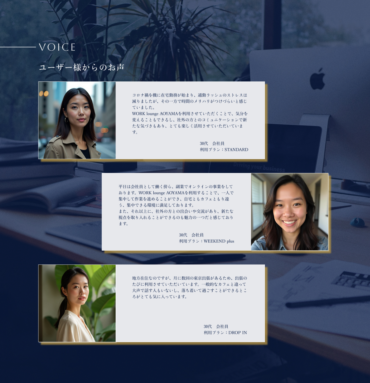 - WORK lounge AOYAMAを利用し始めたきっかけや、さまざまなキャリアの方と出会えるというペルソナに届けたい価値の部分とマッチするコメントを抜粋しています