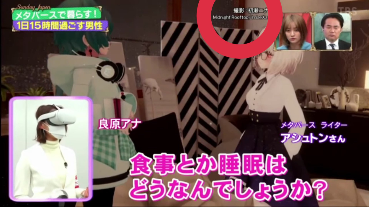 メタバース特集のコーナーでVRChat内を撮影したいとTBSさんから友人経由で有償依頼を受ける。VR内のカメラ撮影と音声調整、OBSなどの配信ツールを使用した収録を行った。放送された画面や詳細についてはTwitterリンクからご覧ください。