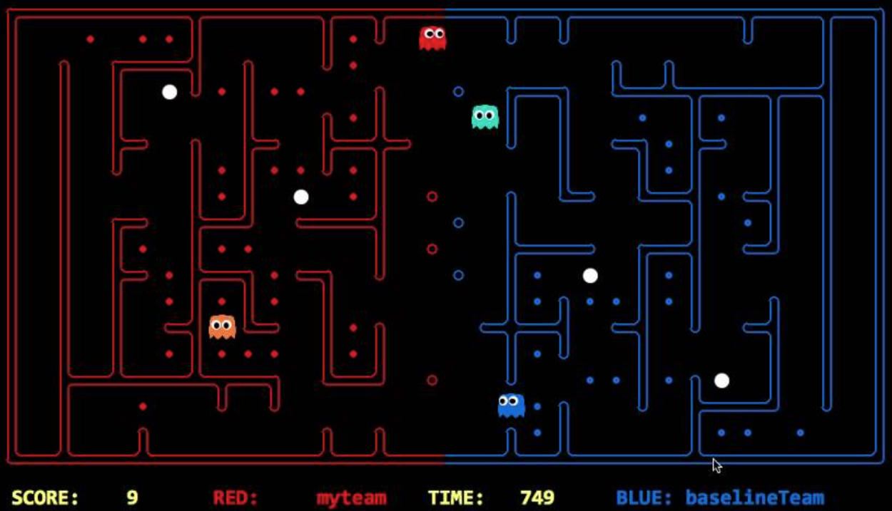カリフォルニア大学バークレー校発のPacmanを使用したAI学習法に基づくコンテストに参加しました。Pacmanを動かすためのAIアルゴリズムを作成し、ほかの参加者のAIアルゴリズムと対戦するコンテストでした。三人チームでしたが、アルゴリズムの設計と実装は私一人でやりました。フィールドは半分半分に分かれ、Pacmanは自分の半分のフィールドにいると、餌を取りに来る相手のPacmanを倒せる鬼になり、そして真ん中の境目を越えて相手のフィールドに侵入すると餌取りできるPacmanになります。動かせるPacmanは二体いますが、私のアルゴリズムでは、攻撃役と防御役に使い分けました。攻撃役はBFWと価値反復法の結合アルゴリズムを使って積極的に相手のフィールドに侵入し餌をとり、相手の鬼が近づいてきたら価値反復法アルゴリズムで一番安全な退避ルートを算出して逃げます。防御役はフィールドの境目を遠く離れず、侵入されない時は機会あれば餌取りに手伝いますが、フィールドが侵入されたらA*アルゴリズムで敵の居場所までの最短距離を算出し、撃退に向かいます。