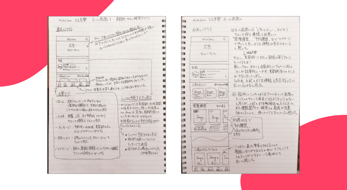 美容院・マツエクサロン・ネイルサロン・エステ・リラクに特化した予約サービス 「minimo」のUIトレースを行いました(一部抜粋)。