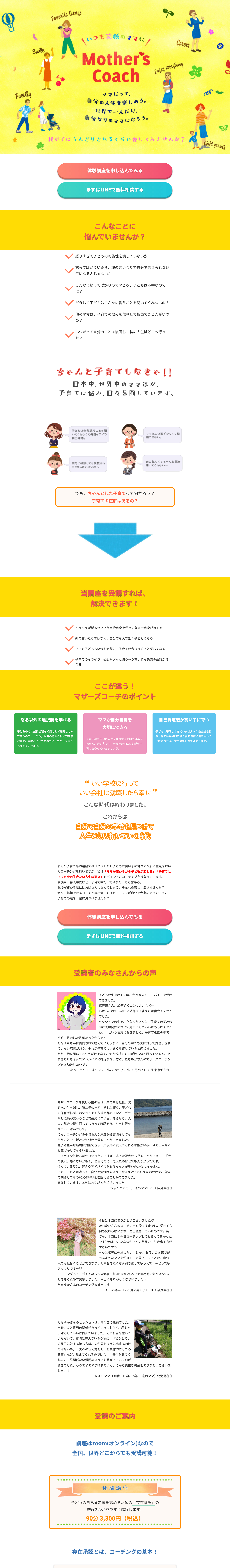 マザーズコーチ様LP作成 nakajima yuri webデザイナー(独学中) いつも笑顔のママに、というテーマと、クライアント様の活発で明るい人柄から、明るくてポップなデザインを検討しました。内容もしっかり伝わるように、見やすさも重要視して作成しました。